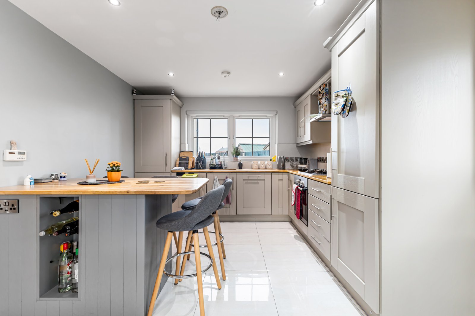 Stunning fitted kitchen with an excellent range of high and low shaker style units and solid oak work tops. Stainless steel single drainer under mounted sink unit with mixer tap. Feature breakfast bar with built in wine rack. Integrated appliances to include single oven, 4 ring gas hob with stainless steel extractor fan, fridge/freezer, washing machine and dishwasher. LED kickboard lighting and recessed spot lights. Gas boiler housing. Tiled floor and part tiled walls. uPVC double glazed door to side.