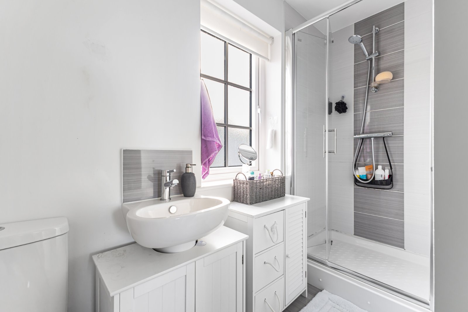 Contemporary white suite comprising low flush WC, wall mounted wash hand basin with mixer tap and enclosed shower cubicle with thermostatically controlled shower. Tiled floor and part tiled walls. Recessed spotlights and extractor fan.