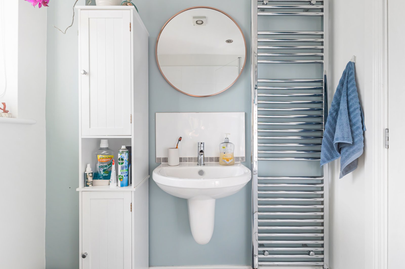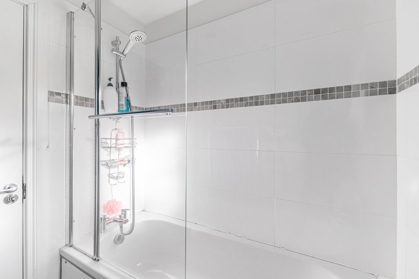 Luxury white suite comprising low flush WC, wall mounted wash hand basin with mixer tap and panel bath with mixer tap and thermostatically controlled shower over. Tiled floor and part tiled walls. Recessed spotlights and extractor fan.