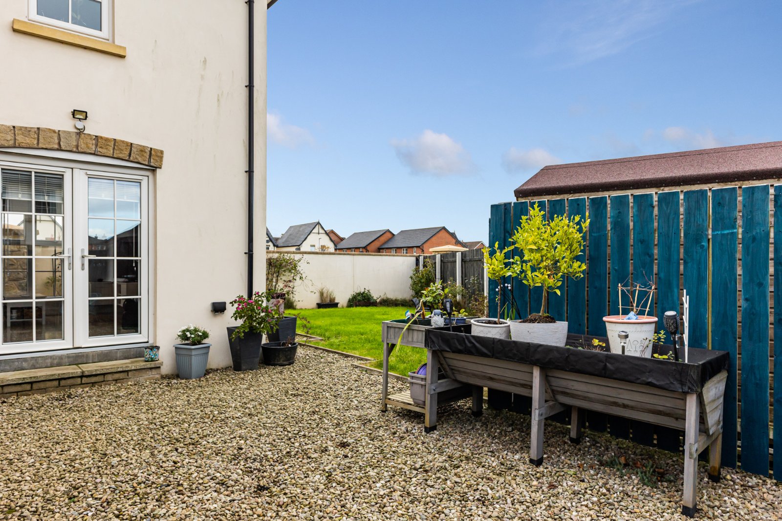 Enclosed rear garden laid in lawns with feature stone patio area. Exterior power socket. Garden shed.
