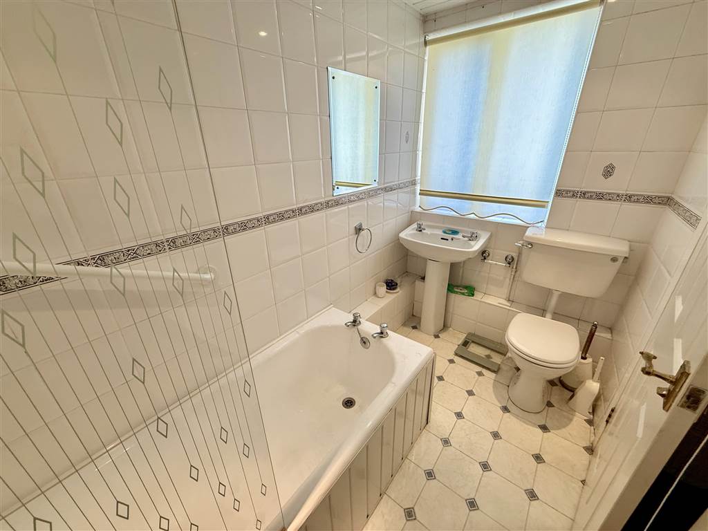 Panelled bath. Redring electric shower and shower screen. Pedestal wash hand basin. Low flush wc. Part tiled walls. PVC panelled ceiling with recessed spotlights. Separate hotpress.