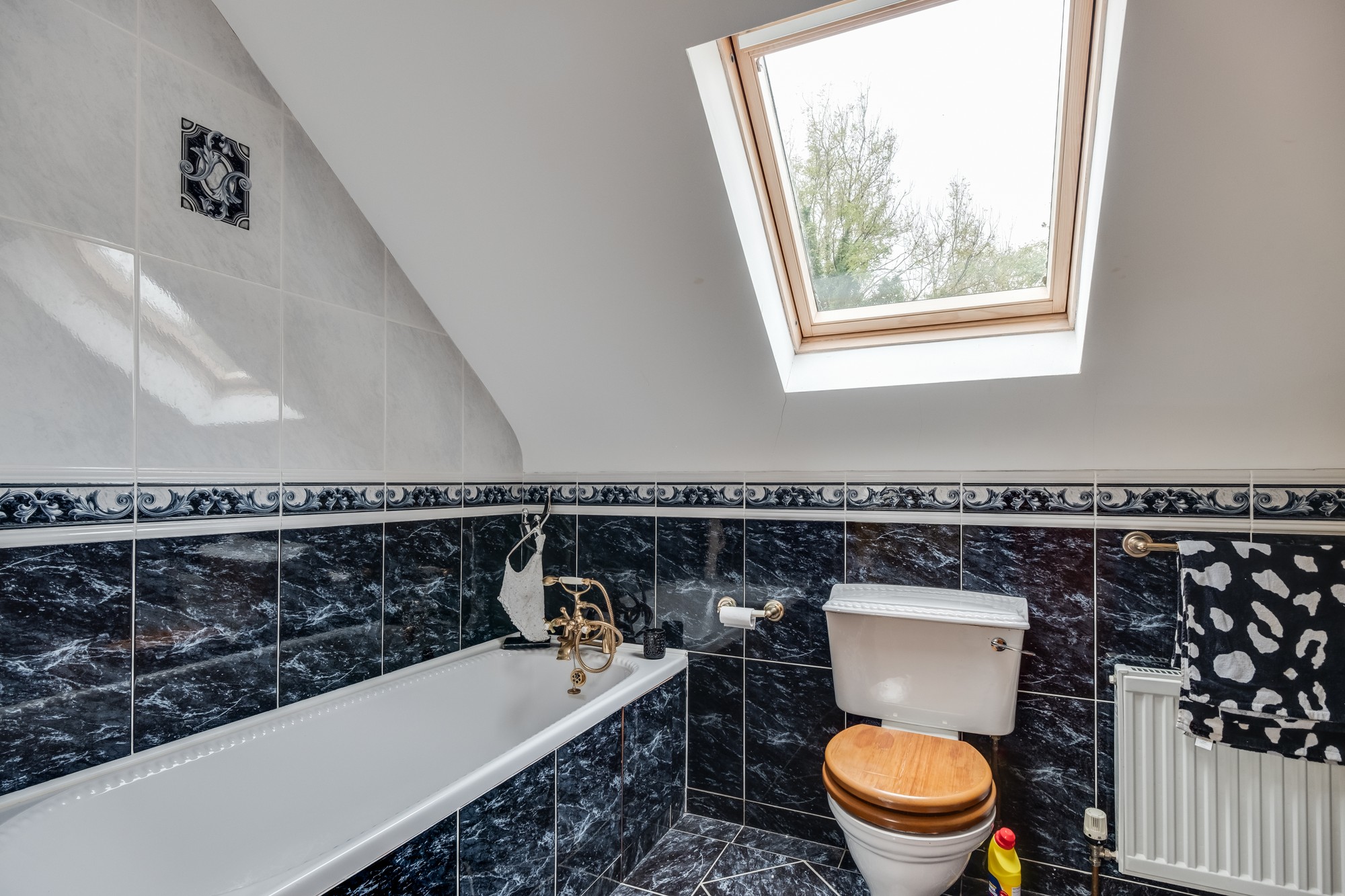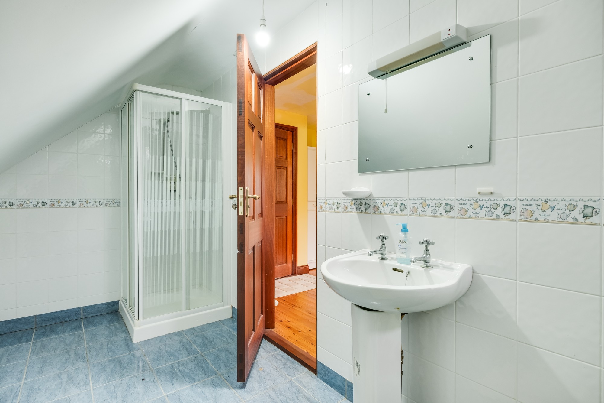 Bathroom: 10’2” x 6’4” White suite, step in shower cubicle with electric shower, fully tiled