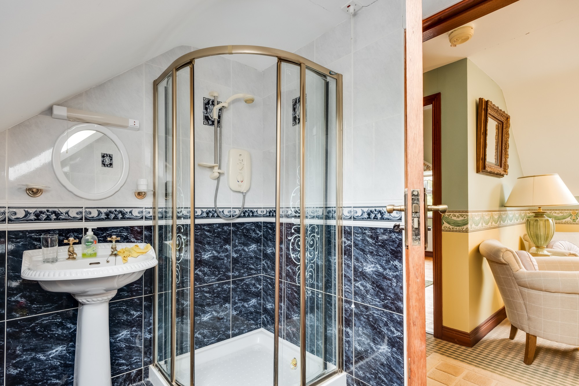 En-suite: 13’4” x 5’8” White suite inc step in shower cubicle with electric shower, fully tiled