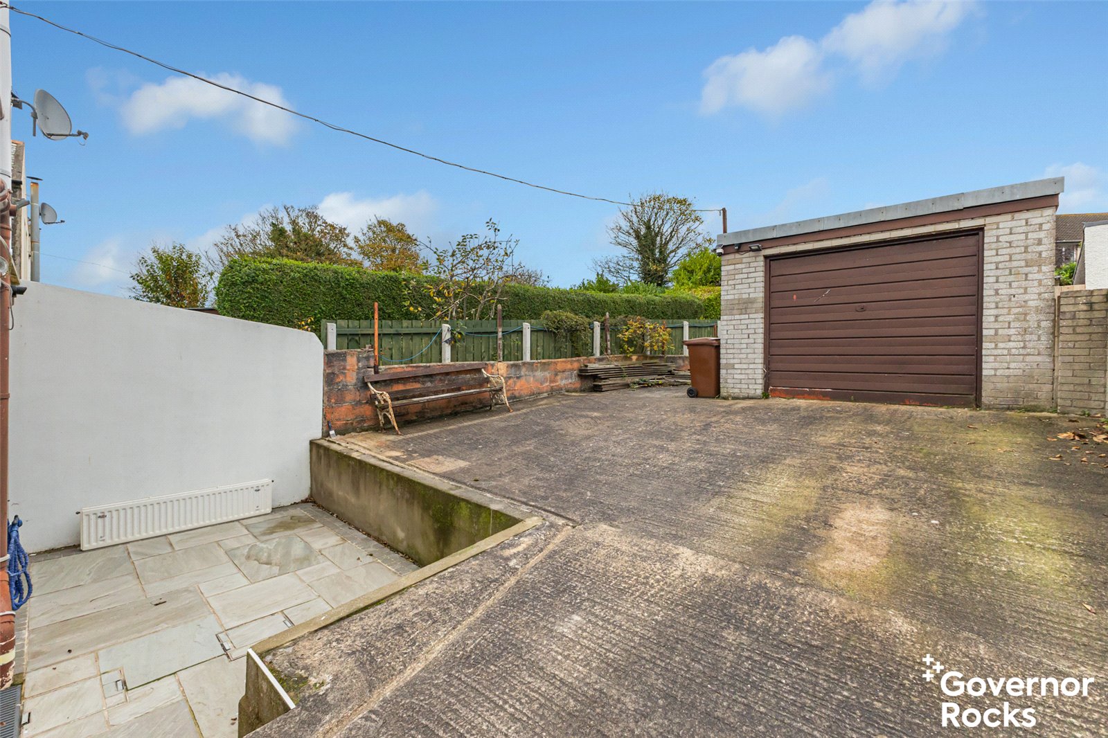 The property is enhanced by its extensive outdoor features: a detached garage measuring approximately 6.5m x 3.6m, suitable for a hobby room or additional storage, and a substantial 7m x 4.5m shed at the rear, ideal for use as a workshop or studio. The low-maintenance garden, primarily laid in concrete, features a charming paved patio area accessible from the conservatory-perfect for al fresco dining or morning coffee.