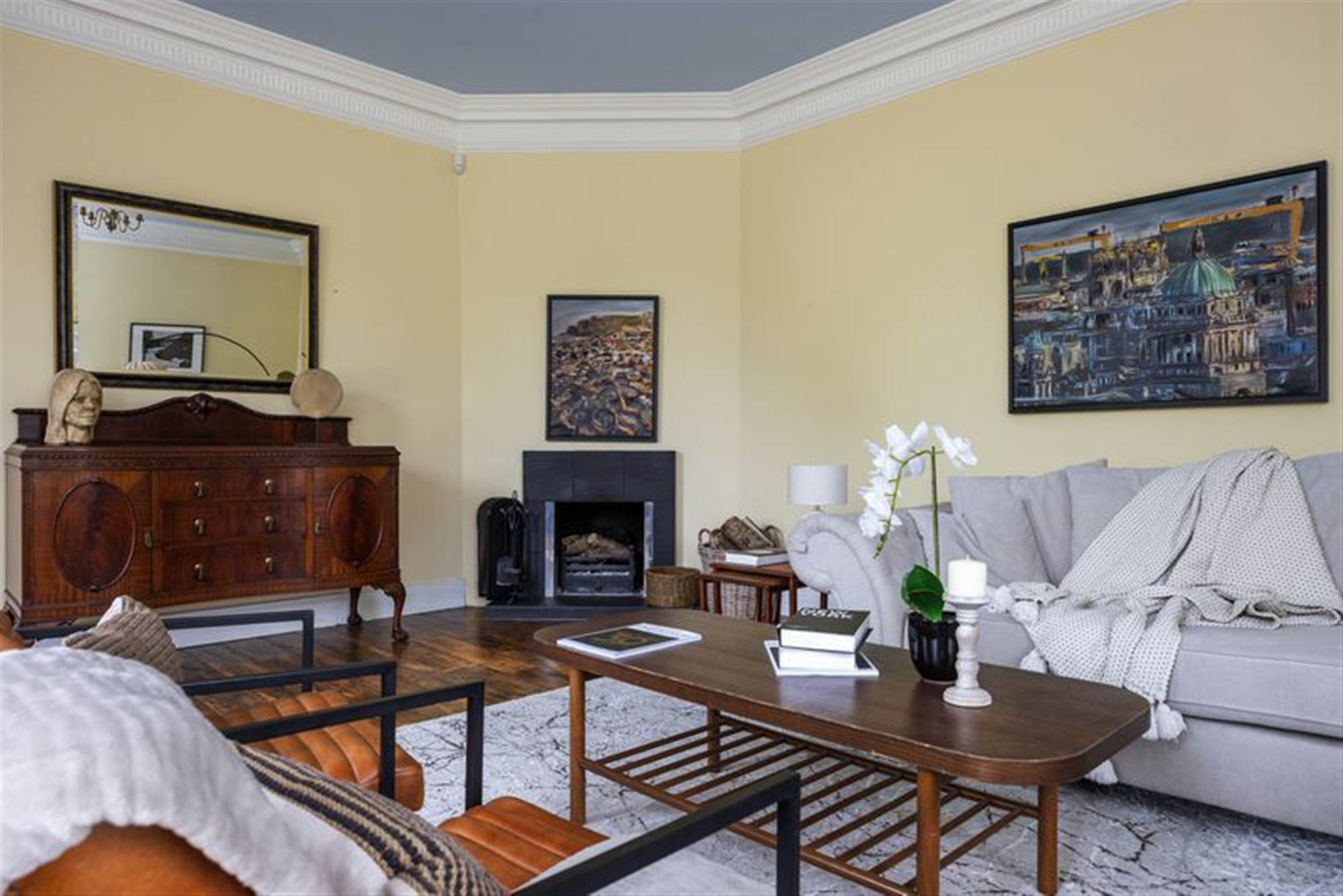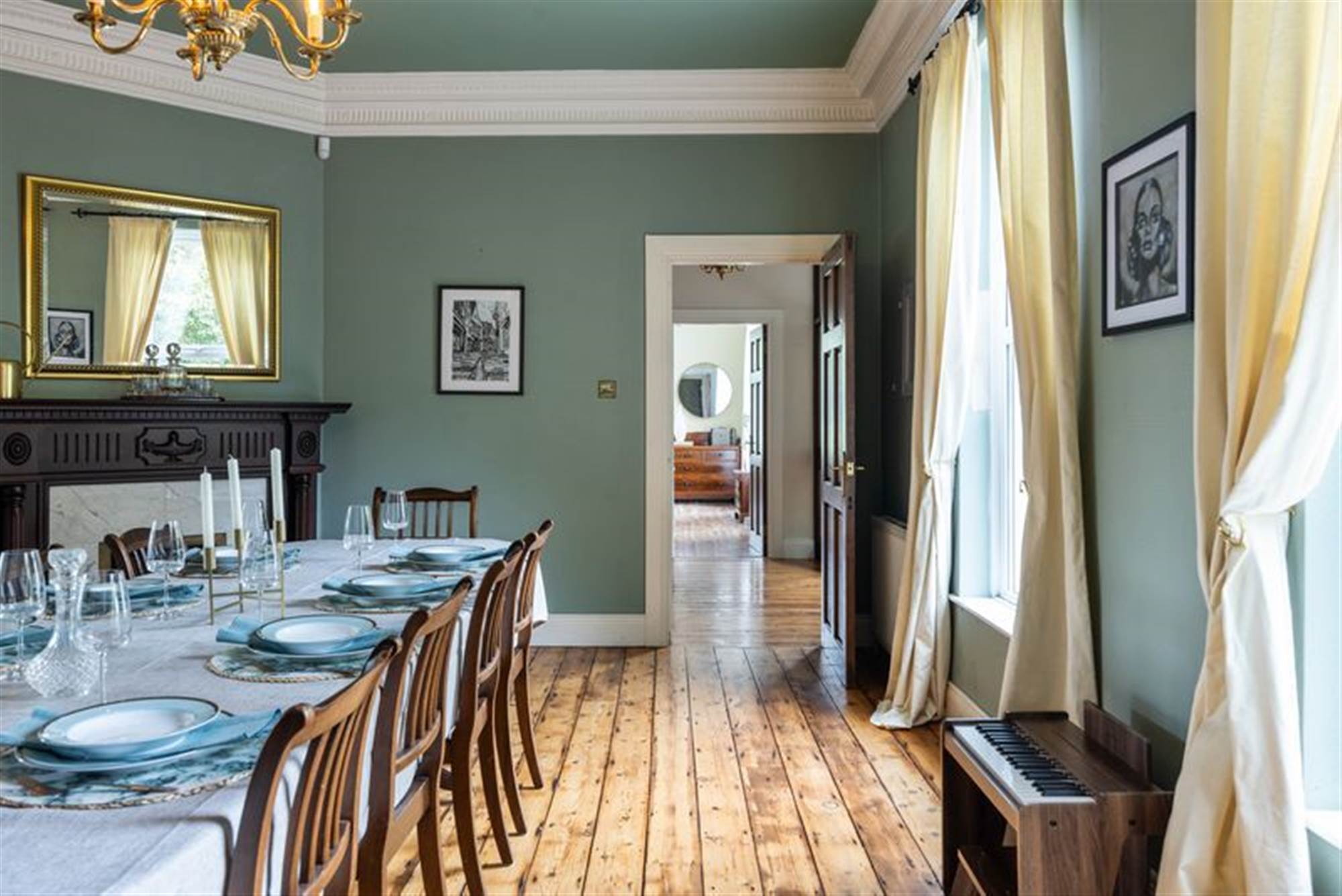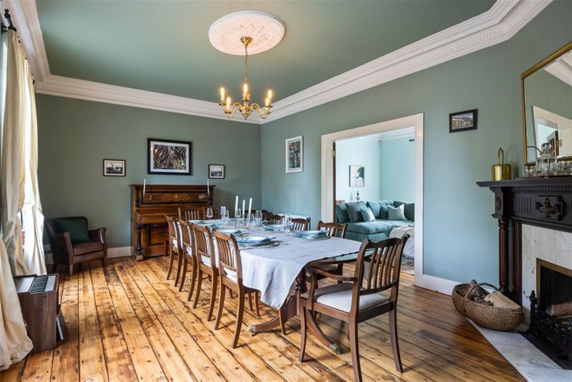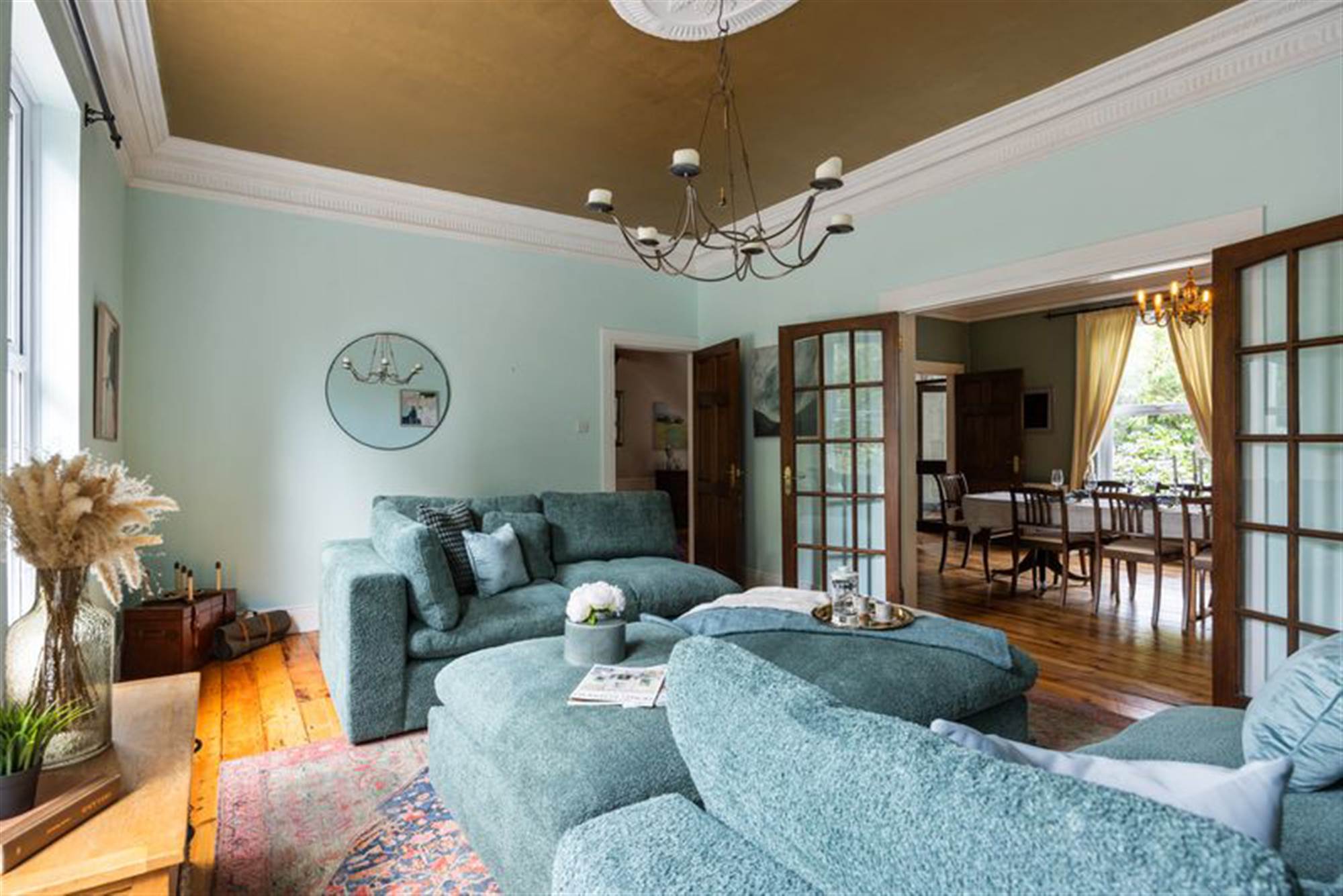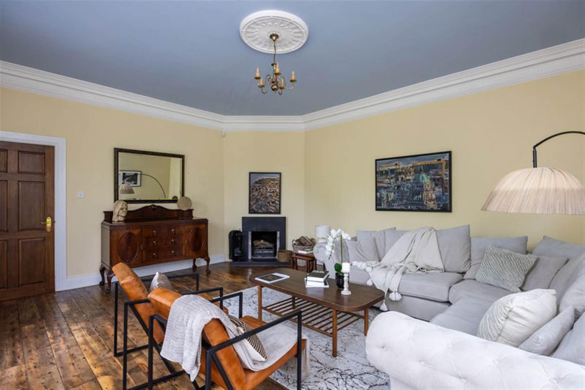 A grand pillared entrance opens to a sweeping driveway with ample parking, leading to the impressive home beyond. Inside, the spacious and versatile accommodation features four reception rooms, each designed for comfort and flexibility from family gatherings to quiet relaxation. Three-metre-high ceilings with ornate cornices create an immediate sense of grandeur, while beautiful wood flooring flows throughout the ground floor. The living spaces are enhanced by two charming feature fireplaces, adding warmth and character to the heart of the home.