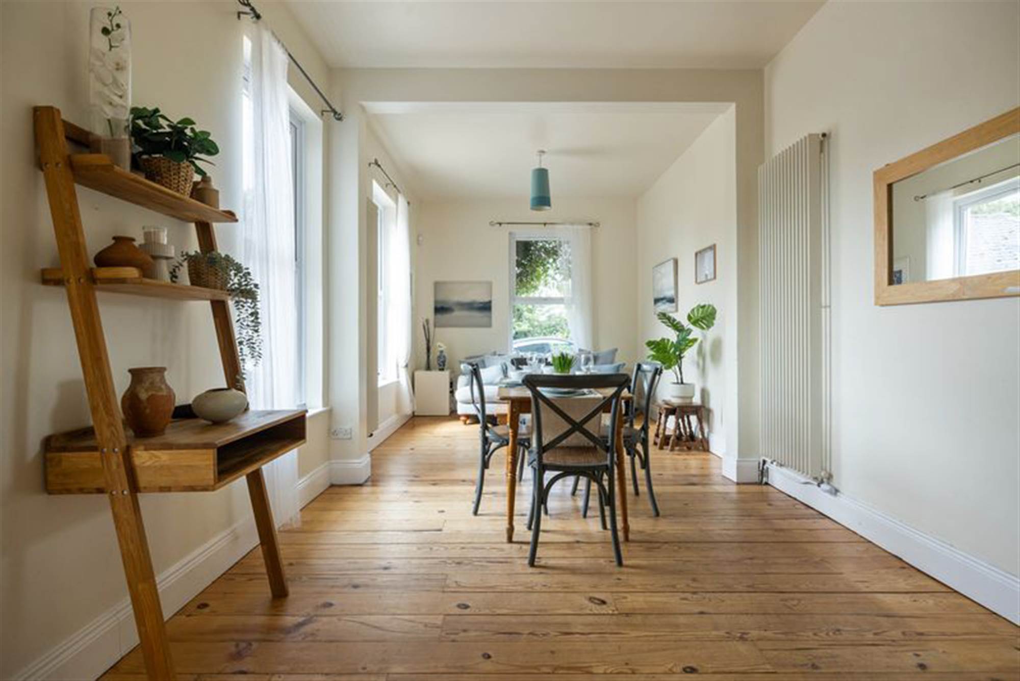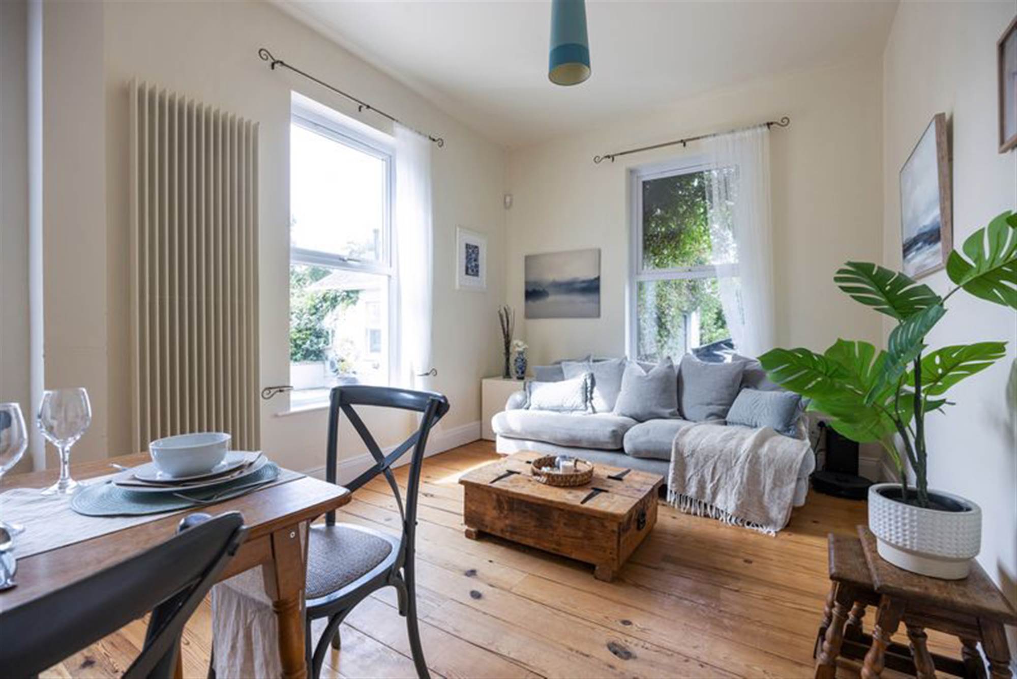 Warm and inviting living area with solid wooden flooring and twin double panel radiators.