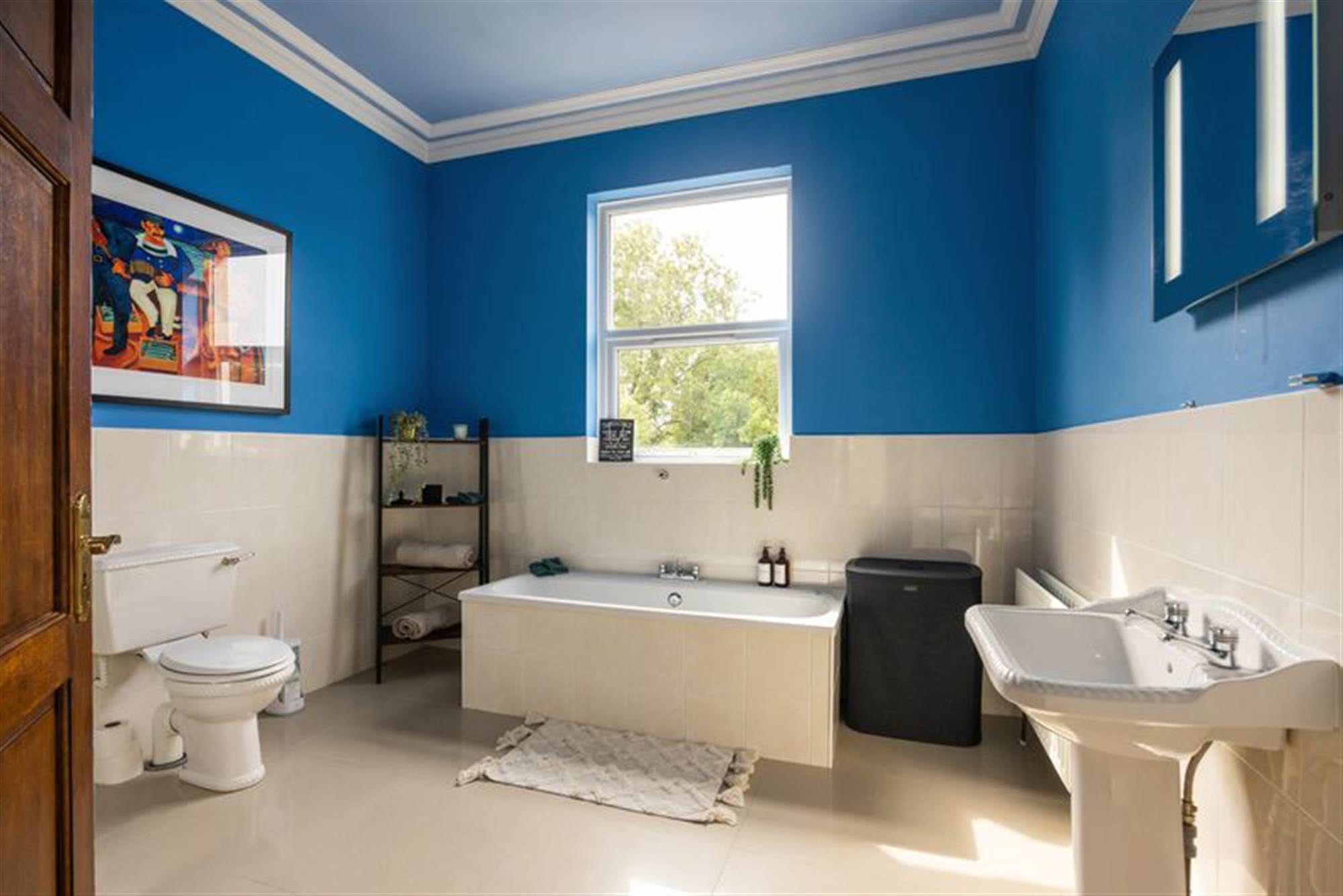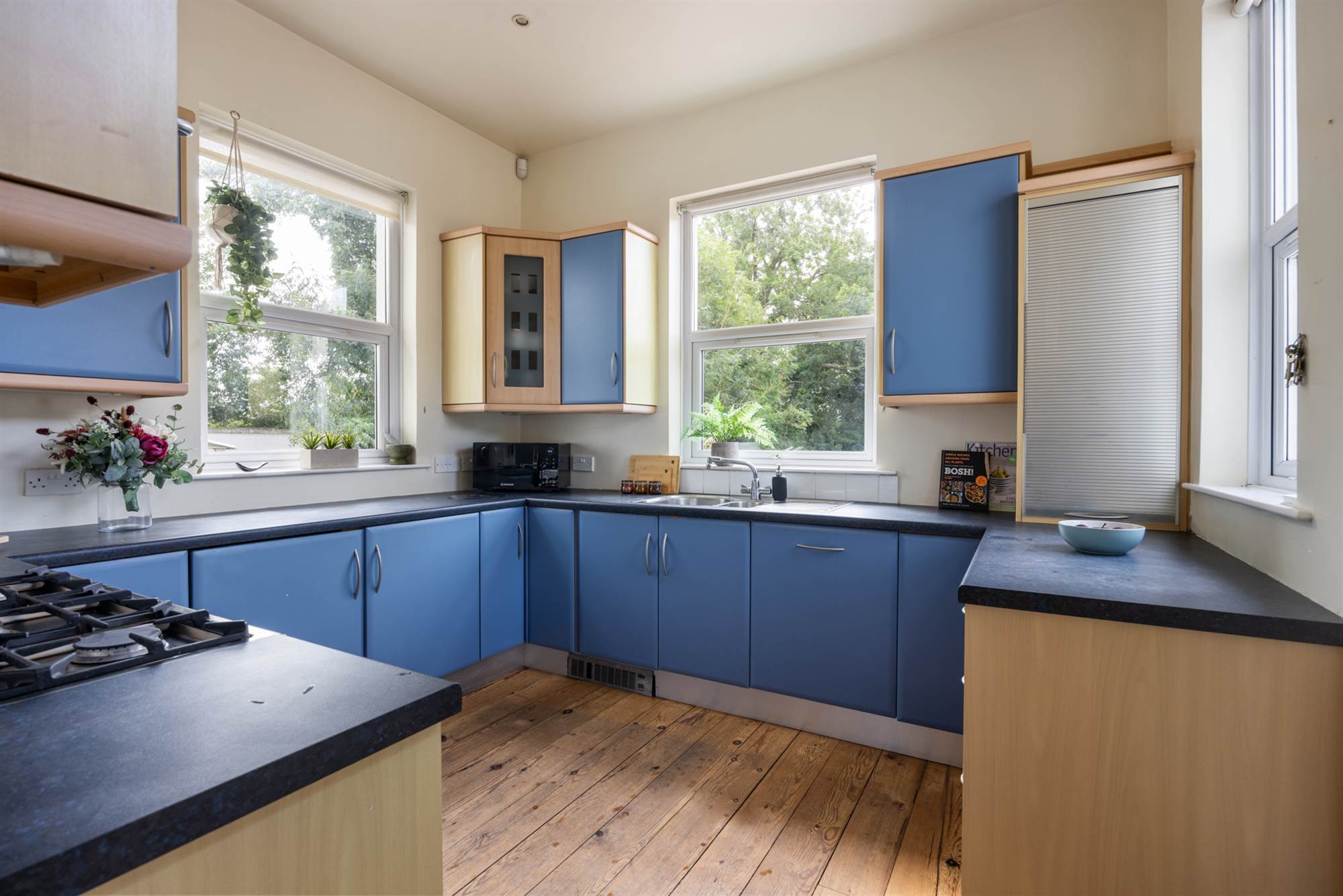 Coupled with the breakfast room, this triple l-aspect, practical kitchen provides huge potential. Blue fitted kitchen offering excellent high- and low-level storage. Includes a 1.5 bowl stainless steel sink with drainer, a 5-ring Kenwood gas oven with stainless steel extractor fan and splashback, integrated dishwasher and fridge, solid wood flooring, part-tiled walls, recessed lighting, and direct access to the rear patio via a solid wood door.