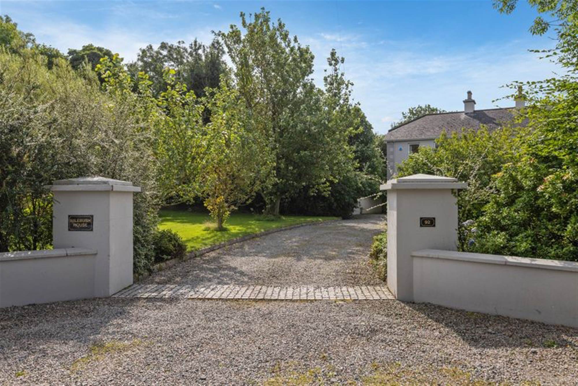 Grand Pillared Entrance Leading To A Sweeping Driveway With Ample Parking For Multiple Vehicles
