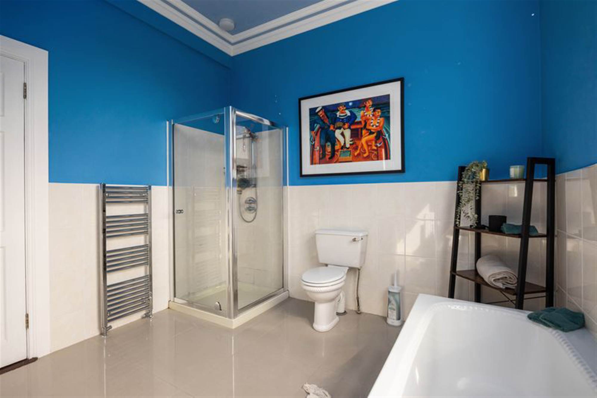 Luxurious four-piece suite including shower cubicle with stainless steel mixer tap, low flush W.C., tiled bath with mixer taps, pedestal basin, partial wall tiling, chrome heated towel rail, porcelain tiled flooring, and a double panel radiator.