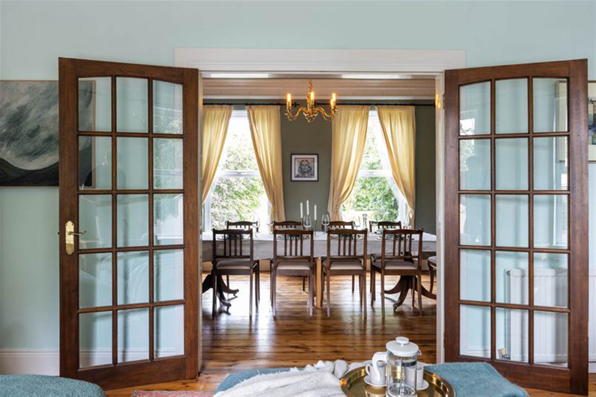 A grand entrance with 8ft double solid wood doors, feature marble step and solid wooden flooring. Includes a single panel radiator and glazed double doors leading into the entrance hall.