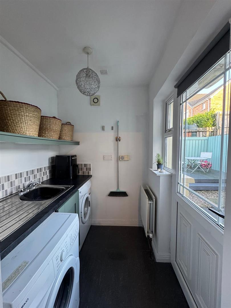 Having sink unit, plumbed for washing machine, space for tumble dryer, tiled floor.