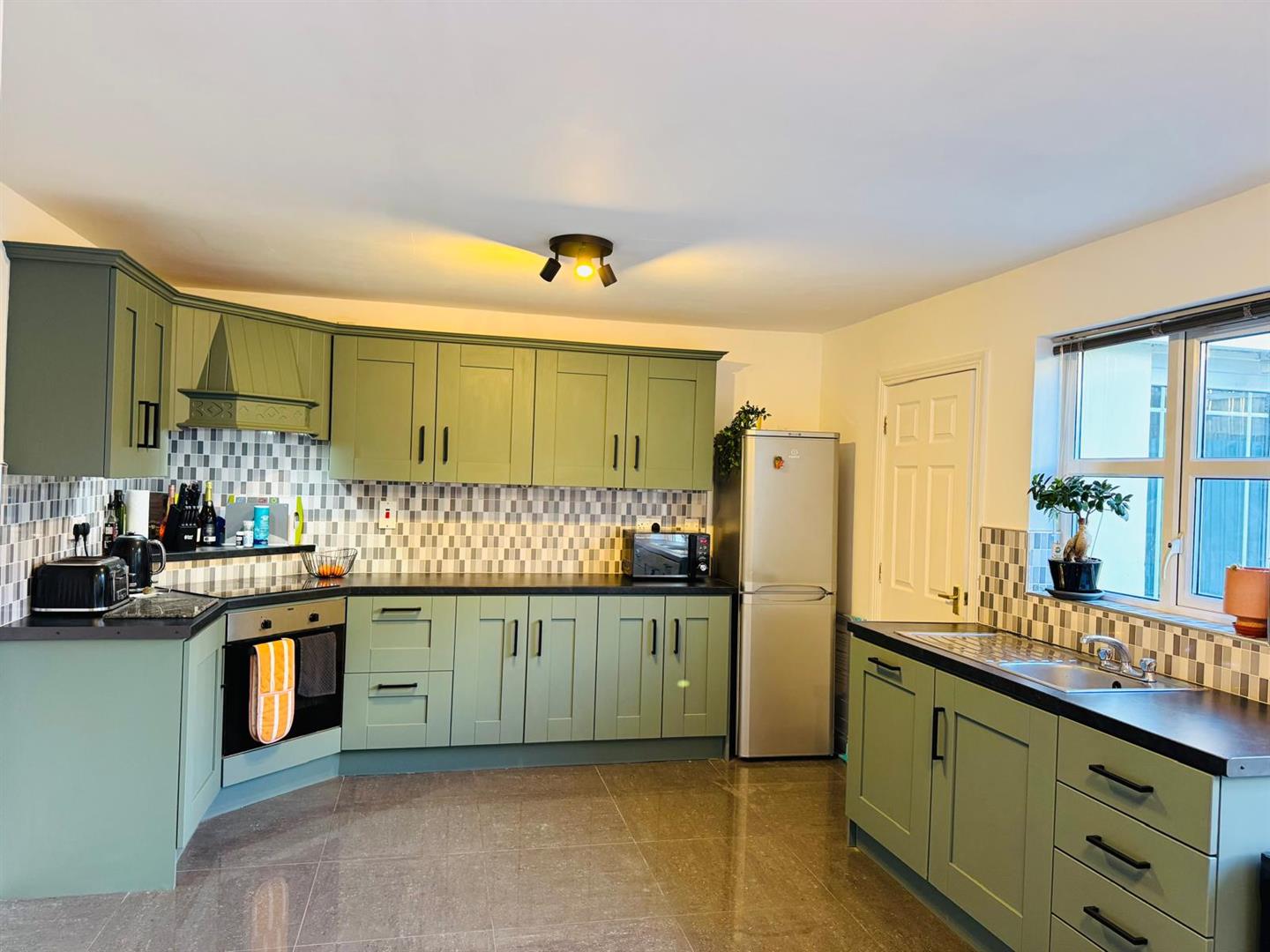 Having range of eye and low level units, tiling between units, single drainer stainless steel sink unit with mixer taps, hob, underoven, extractor canopy, space for fridge/freezer, tiled floor, ample dining space with French doors to rear.