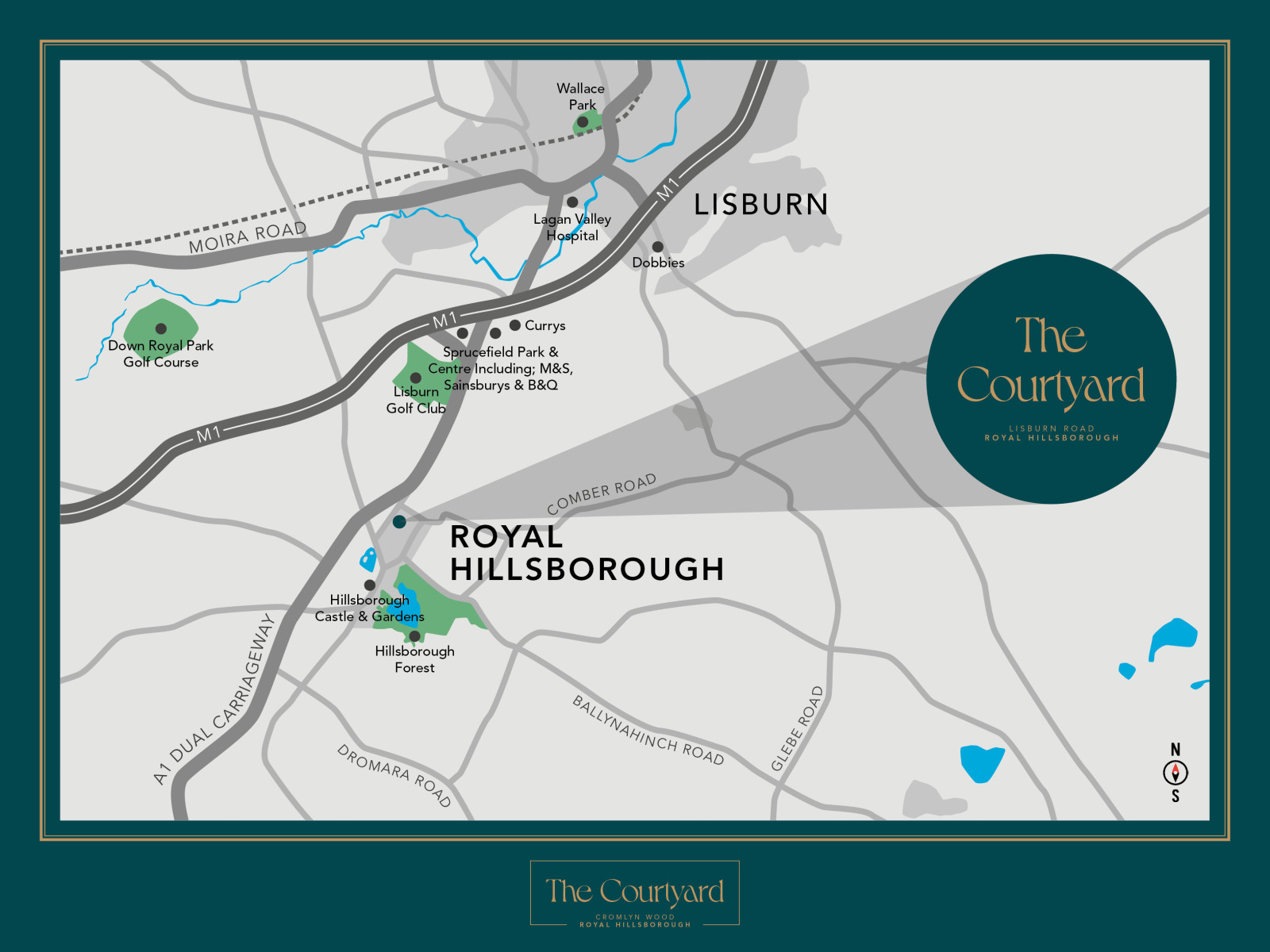 Thanks to excellent road and public transport links, Royal Hillsborough is also situated within a short drive of Belfast´s bustling city centre, meaning that the homes at The Courtyard are ideal for those seeking a peaceful escape without sacrificing urban convenience. With an accessibly placed bus stop situated right outside of the Cromyln Wood development, in addition to Sprucefield Park and Ride located less than three miles away, homeowners can experience hassle free travel to Belfast City and beyond. If a commute to further afield is required, both Belfast International Airport and George Best City Airport can also be easily accessed.
