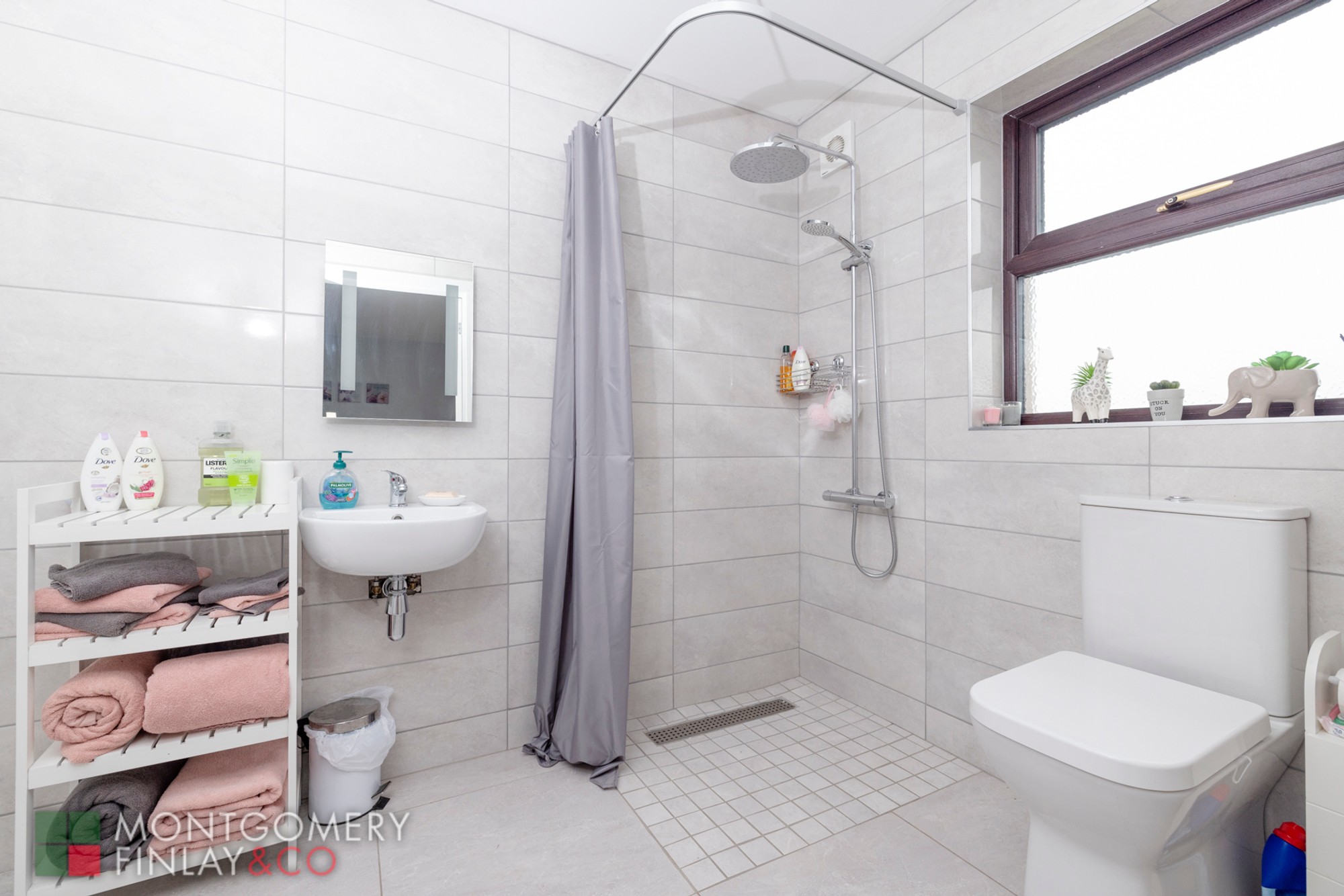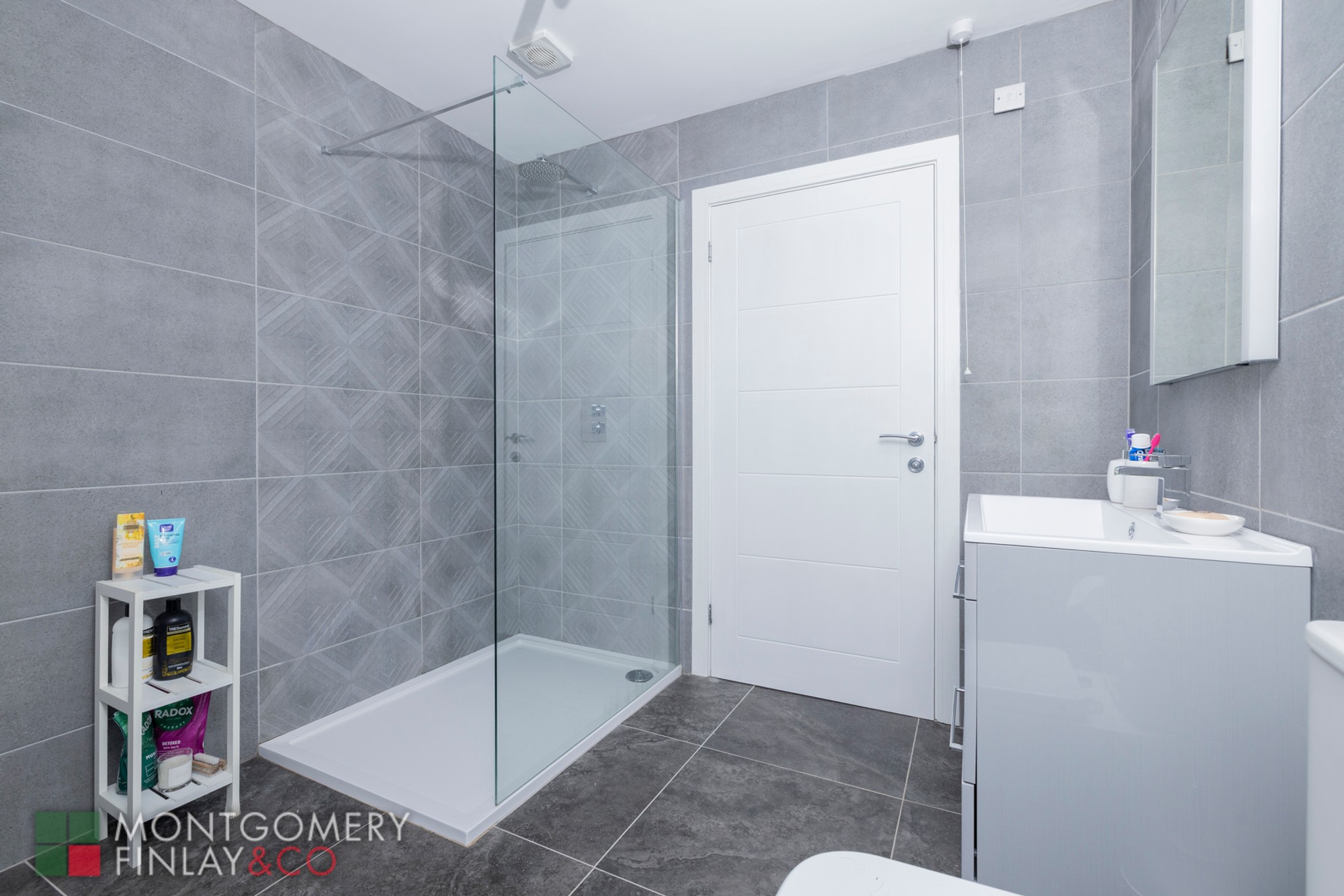 Fully tiled wet room with walk-in thermostatic shower, W.C., wash hand basin, and heated towel rail.