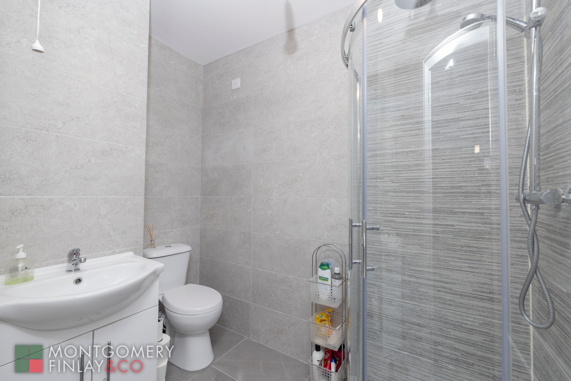 Corner thermostatic shower, W.C., vanity unit, fully tiled floor and walls.