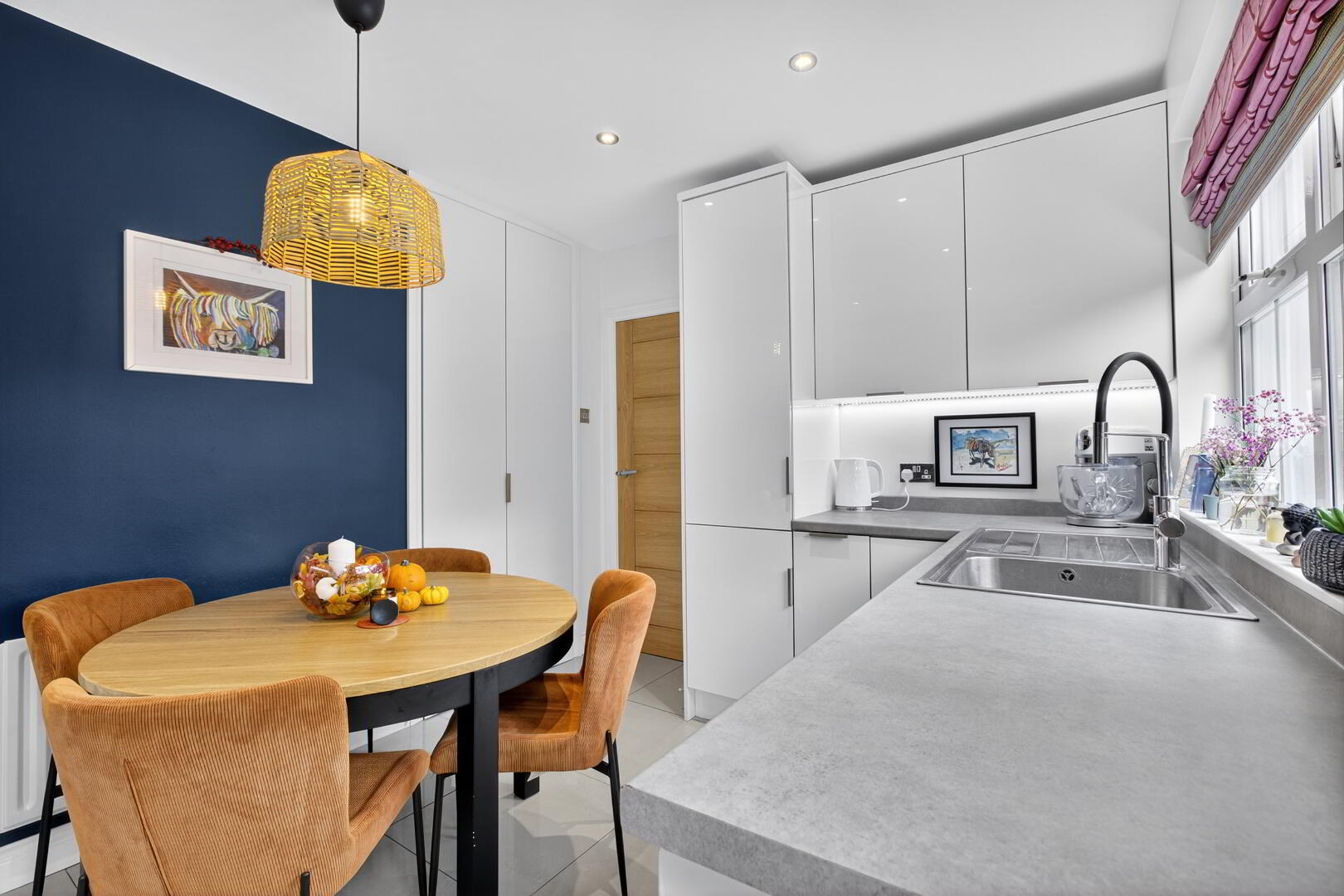 Range of high gloss eye and low level units with integrated electric hob, extractor above, high level oven, grill and microwave, dishwasher, stainless steel sink with mixer tap, work surface with matching upstand and tiled splashback, tiled flooring, radiator, built in hot press, recessed ceiling lighting, uPVC double glazed window and door to rear