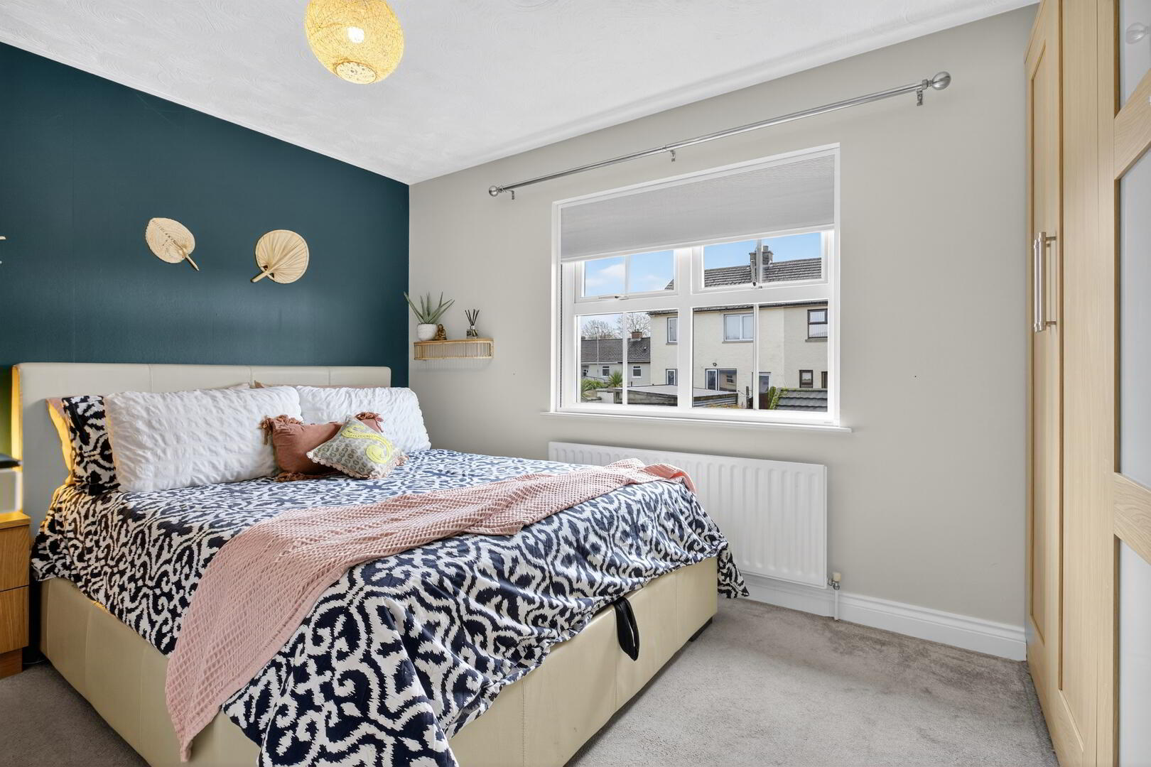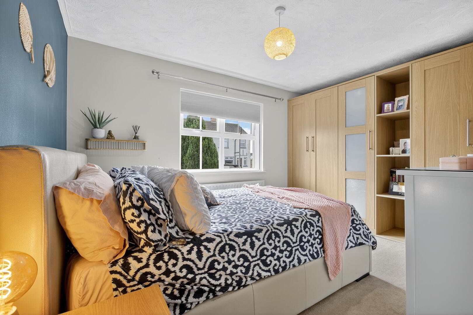 uPVC double glazed window to rear, radiator, fitted wardrobe, shelving unit and chest of drawers