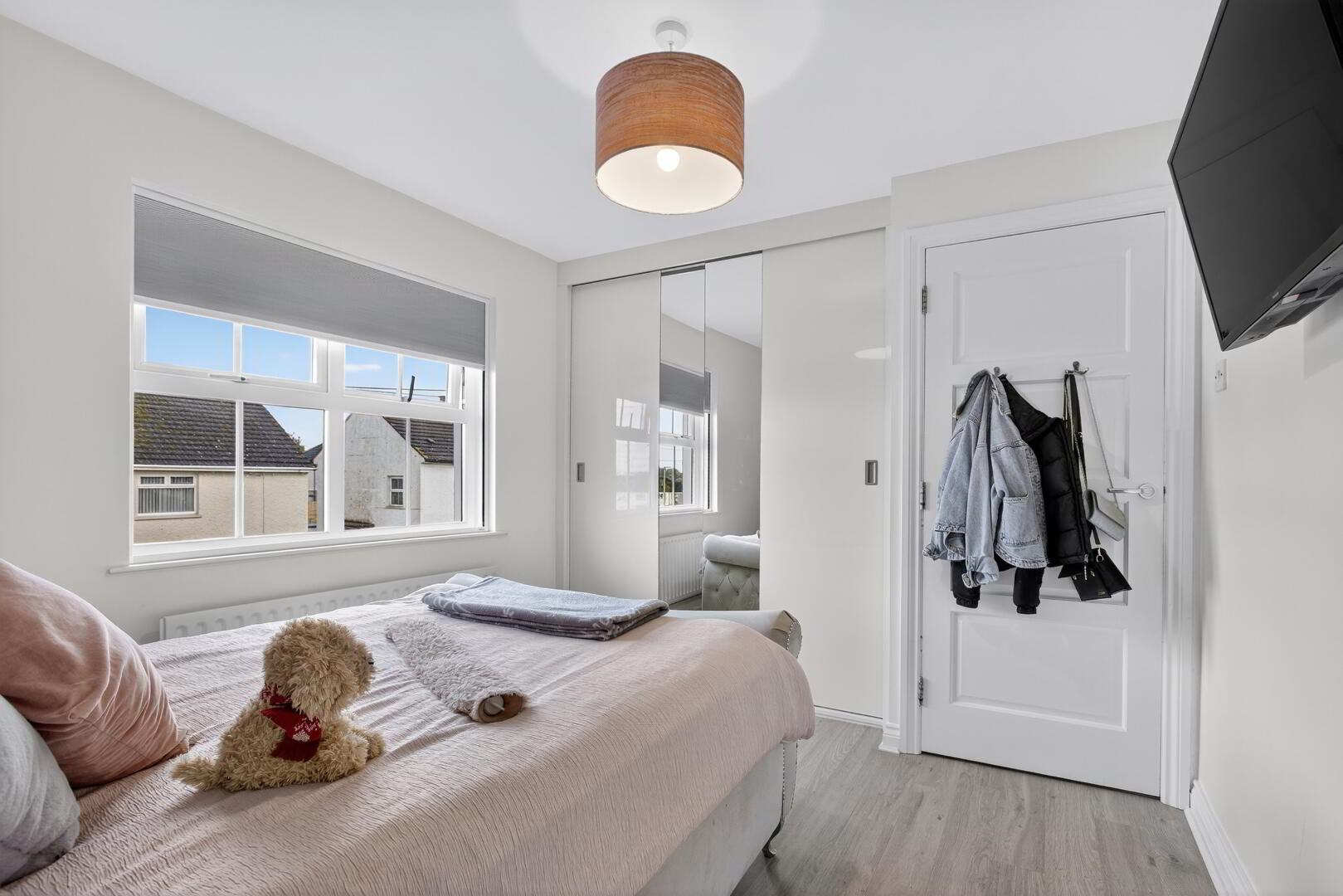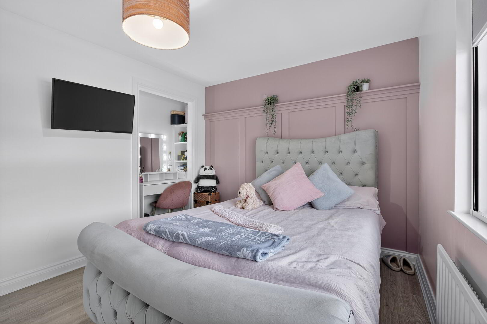 uPVC double glazed window to front, radiator, laminated wooden flooring, built in sliderobe, wood panelling to one wall