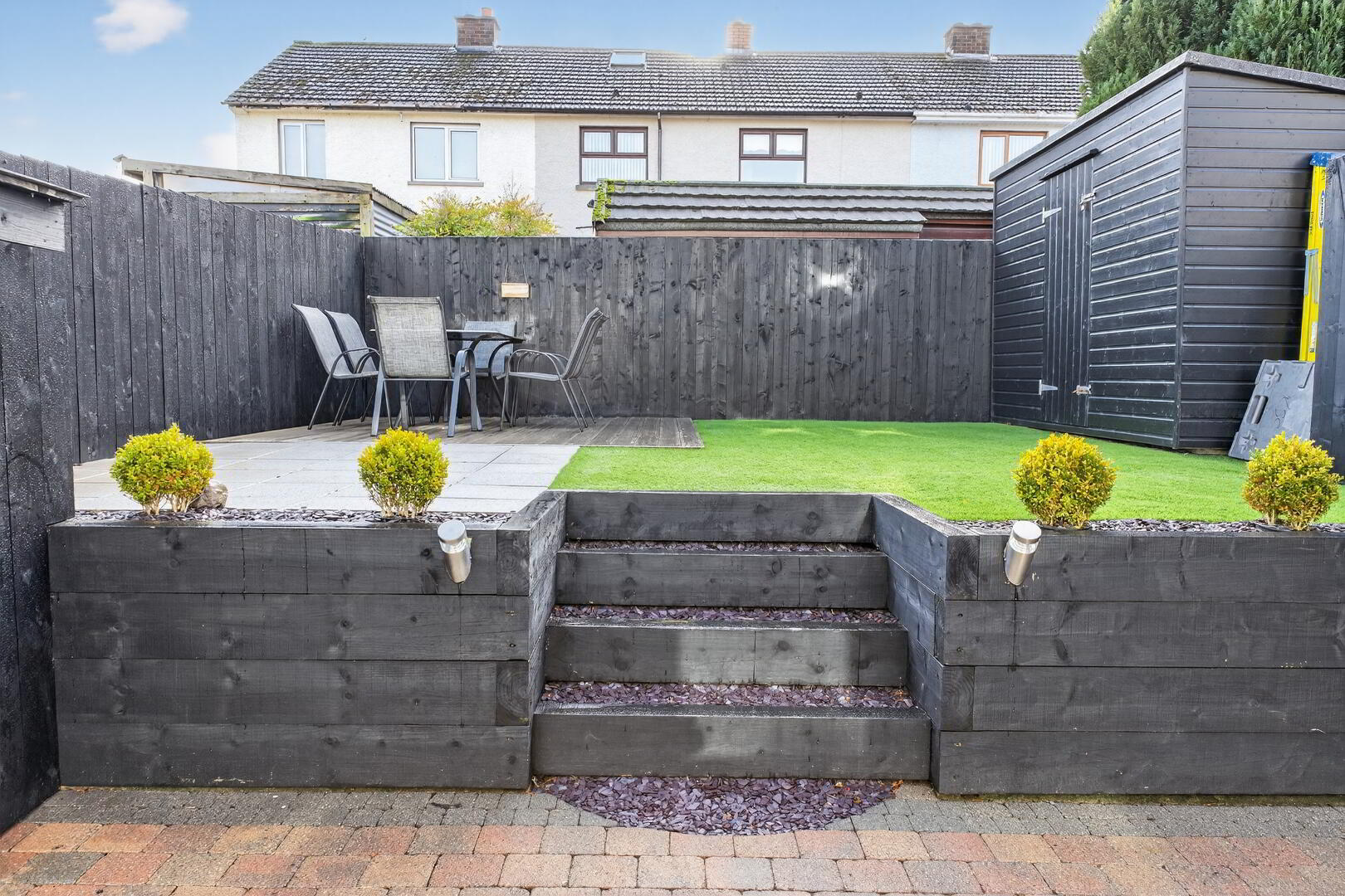 South easterly facing garden to rear with cobbled patio area, steps leading to entertaining area with additional patio and artificial grass area