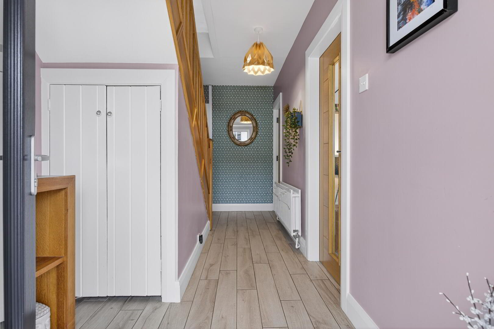 Composite triple glazed door to front with uPVC double glazed side window, tiled flooring, radiator, under stairs storage cupboard, access to lounge, kitchen/diner, ground floor bathroom, oak staircase to first floor