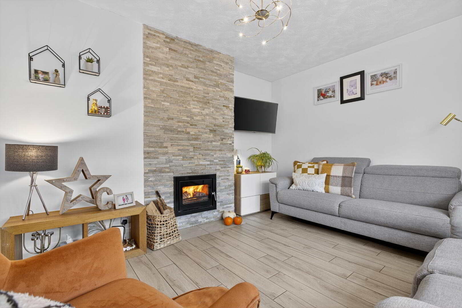uPVC double glazed bay window to front, radiator, multi fuel stove set in stone clad chimney breast, tiled flooring, high level TV point