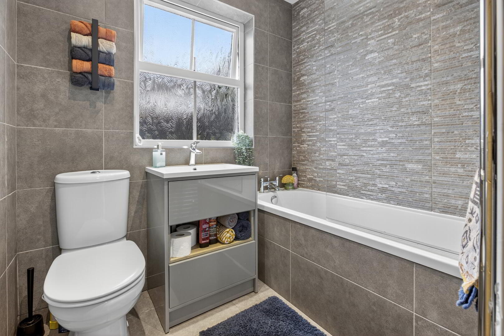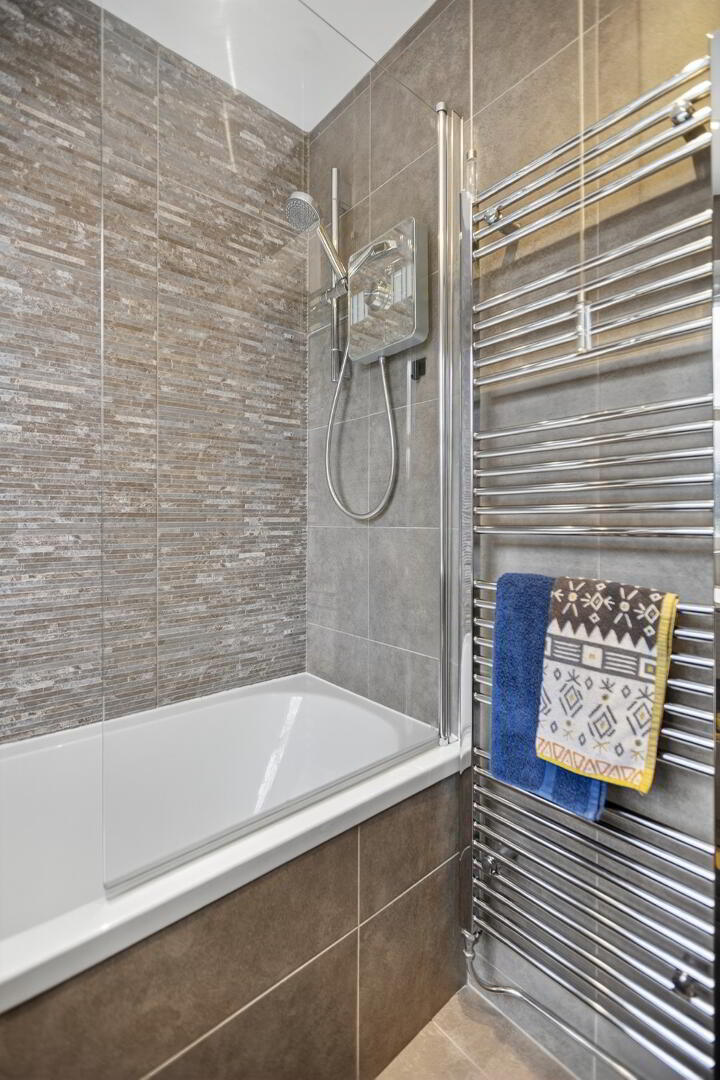 Bath with mixer tap and Aqualisa electric shower over, wash hand basin with mixer tap set on vanity unit, low flush wc, fully tiled walls and flooring, chrome radiator towel rail, recessed ceiling lighting, uPVC double glazed window to rear