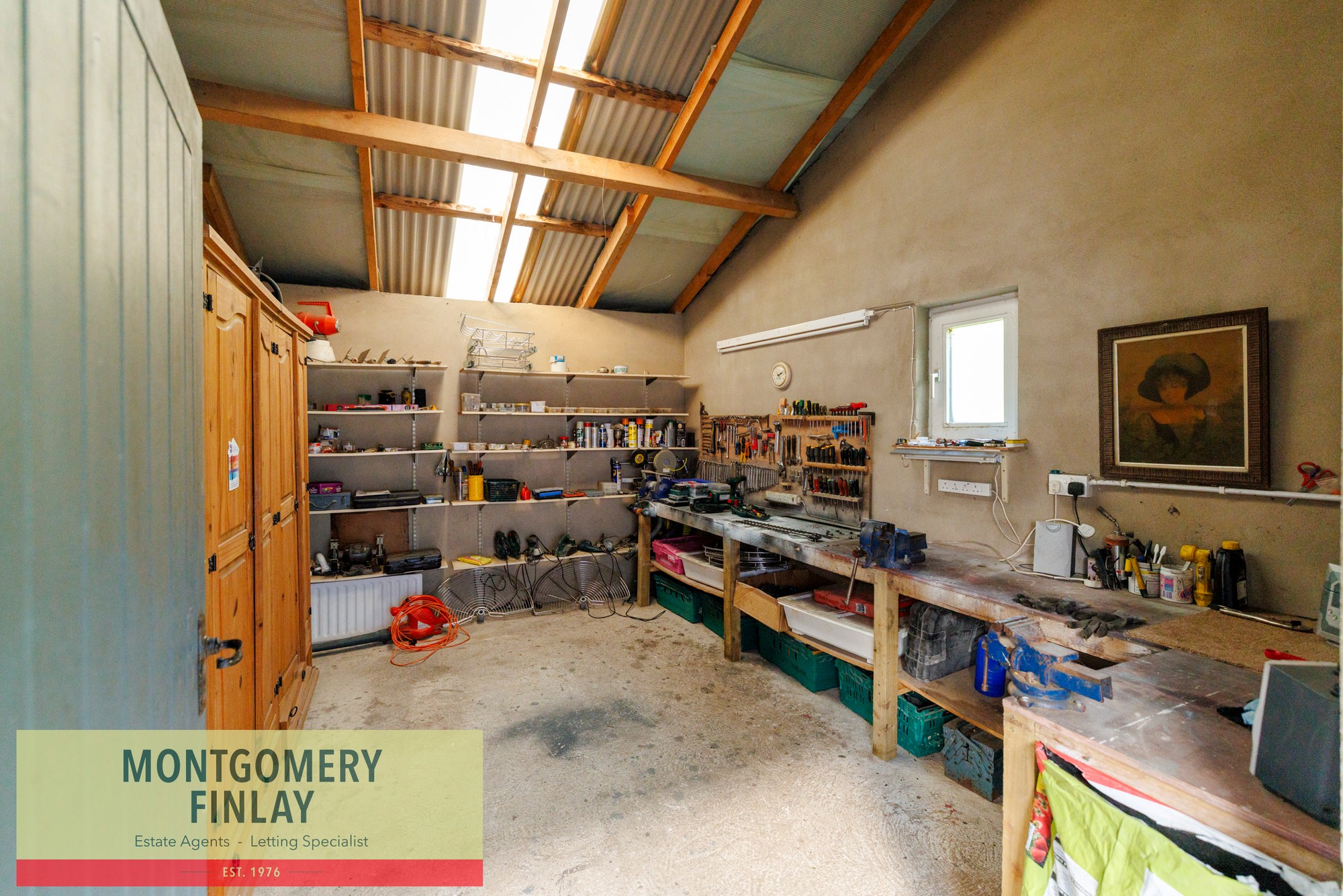 Extensive Outbuildings – Double garage with loft, two stables, and workshop with power and lighting