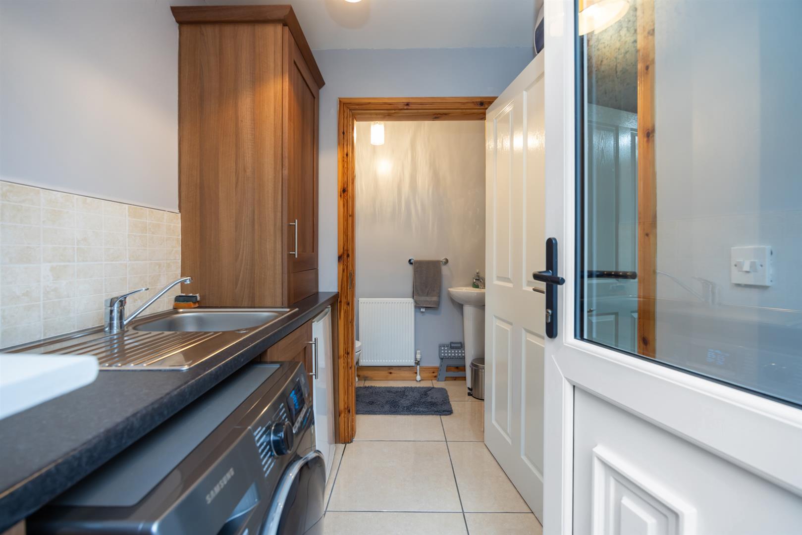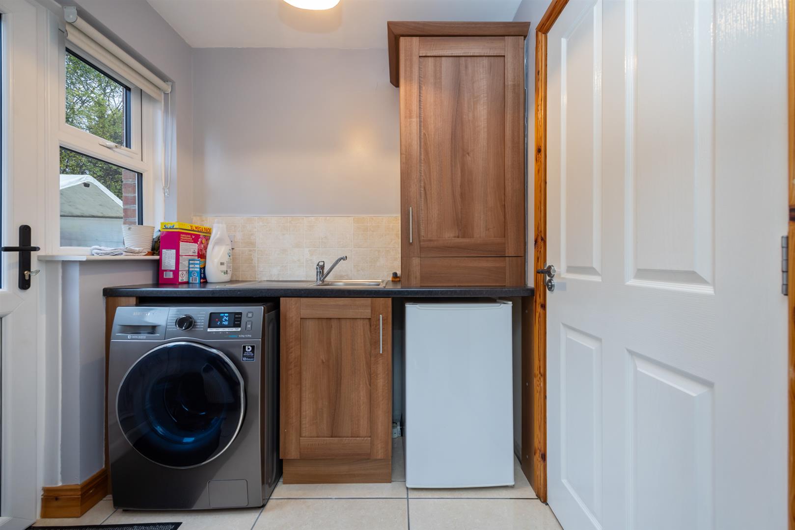 Single drainer stainless steel sink unit, range of high and low level units, formica worktop, plumbed for washing machine, tumble dryer space, partly tiled walls, concealed gas boiler, panelled radiator, uPvc door to rear.
