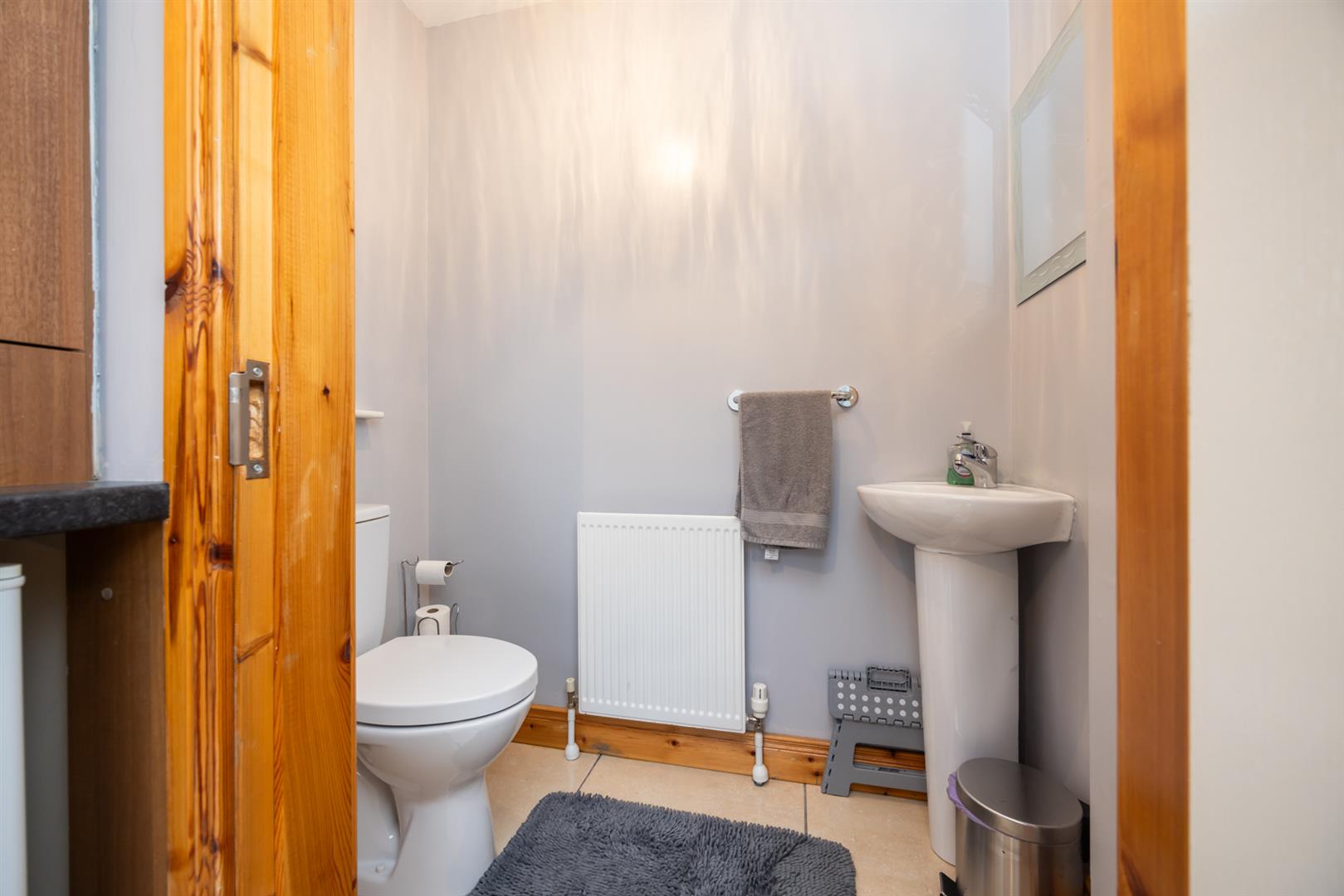 Pedestal wash hand basin, low flush wc, ceramic tiled floor, panelled radiator.