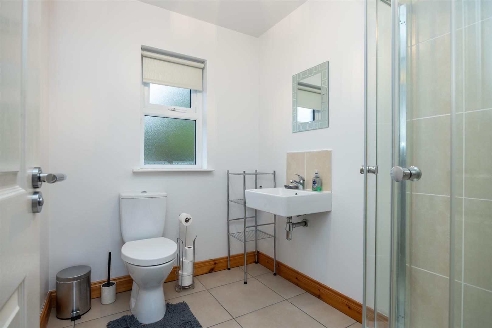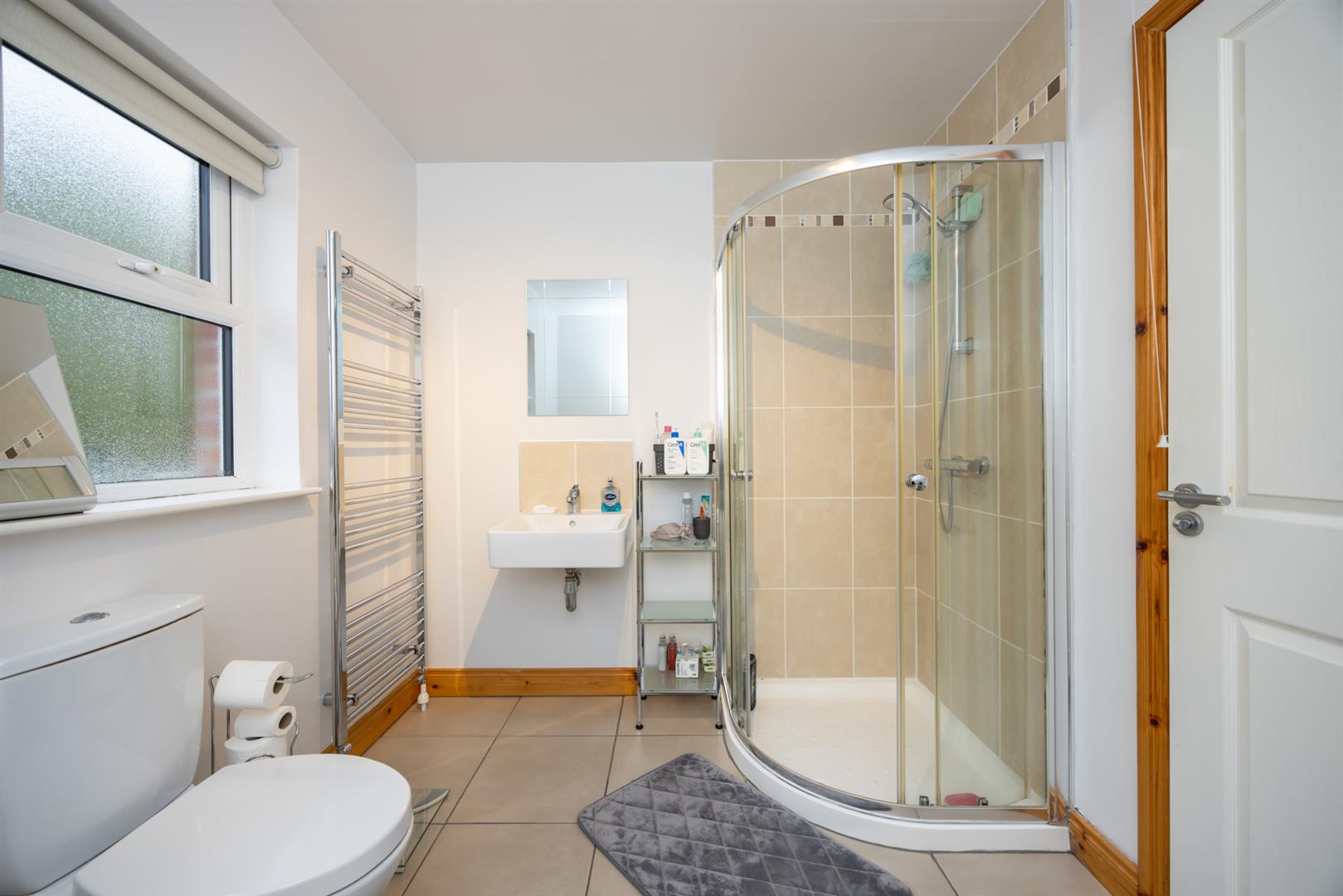 Modern white bathroom suite comprising shower cubicle, wash hand basin, low flush wc, ceramic tiled floor, panelled radiator, extractor fan.