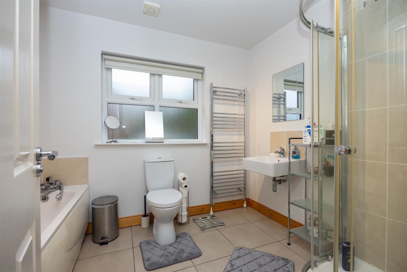 Modern white 4 piece bathroom suite comprising panelled bath, shower cubicle, thermostatic controlled shower unit, wash hand basin, low flush wc, ceramic tiled floor, featured radiator, extractor fan.
