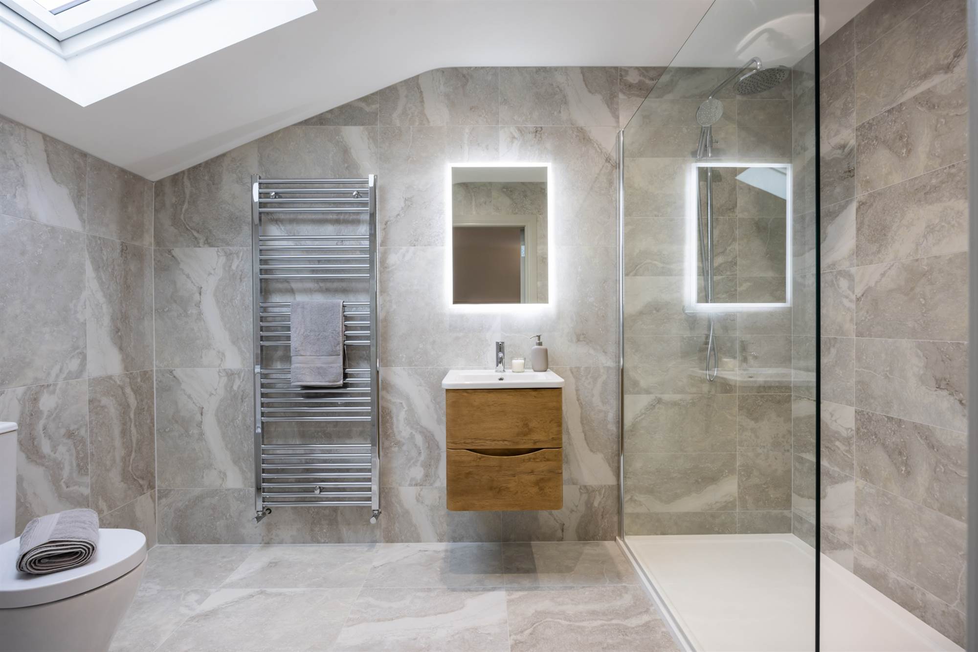Quality sanitary ware including Luca drench showers, Free standing bath, Wall hung vanity units with LED Mirrors and Chrome heated towel rails.