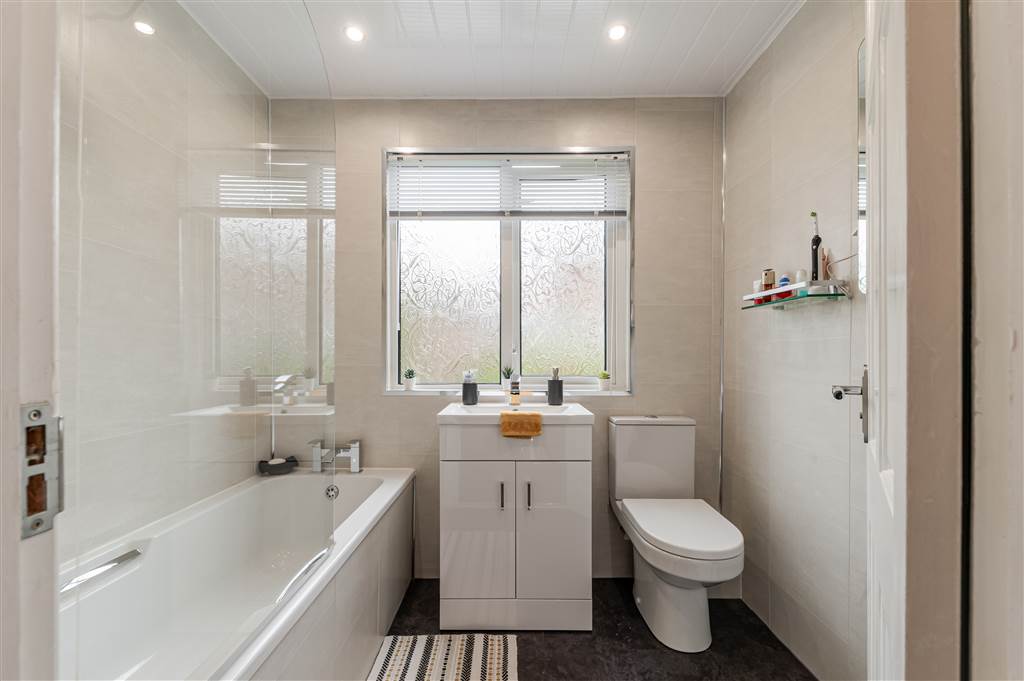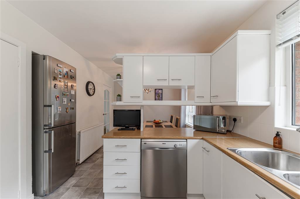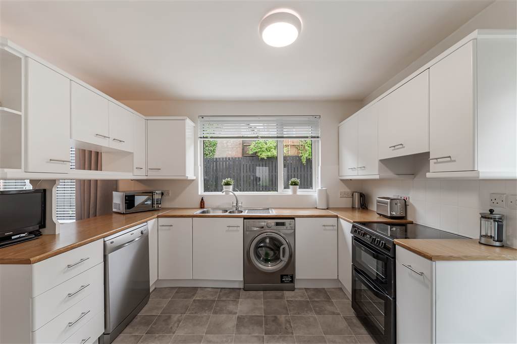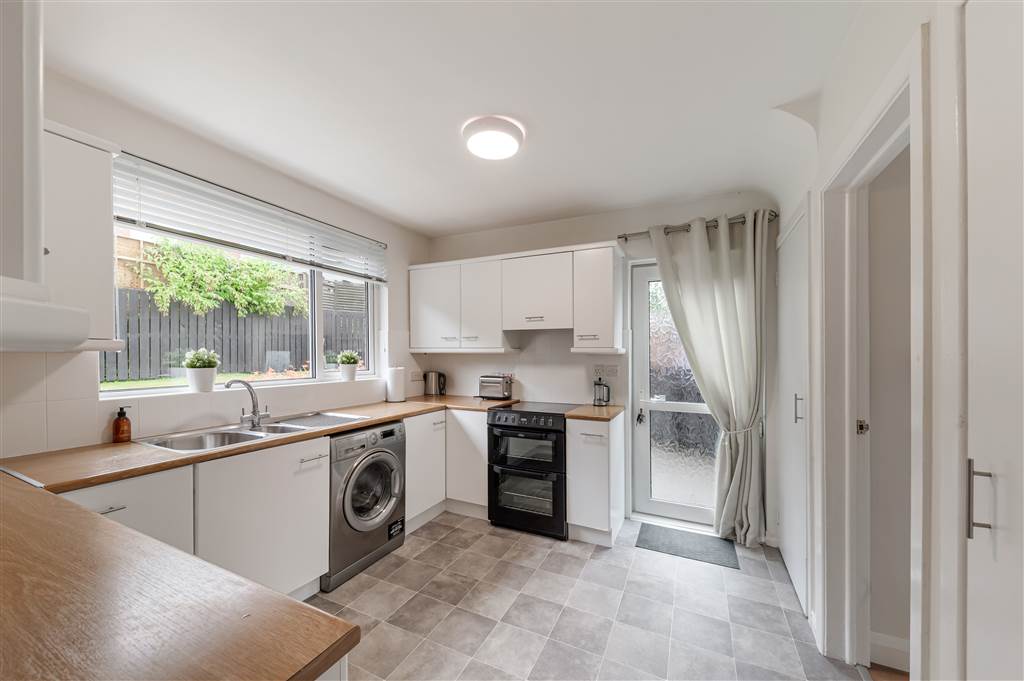 Excellent range of high and low level units, Formica work surfaces, stainless steel sink unit with mixer taps, cooker space, integrated extractor fan, plumbed for washing machine, space for dishwasher, fridge freezer space, two larder cupboards, partly tiled walls, double panelled radiator, gas fired central heating boiler open to dining.