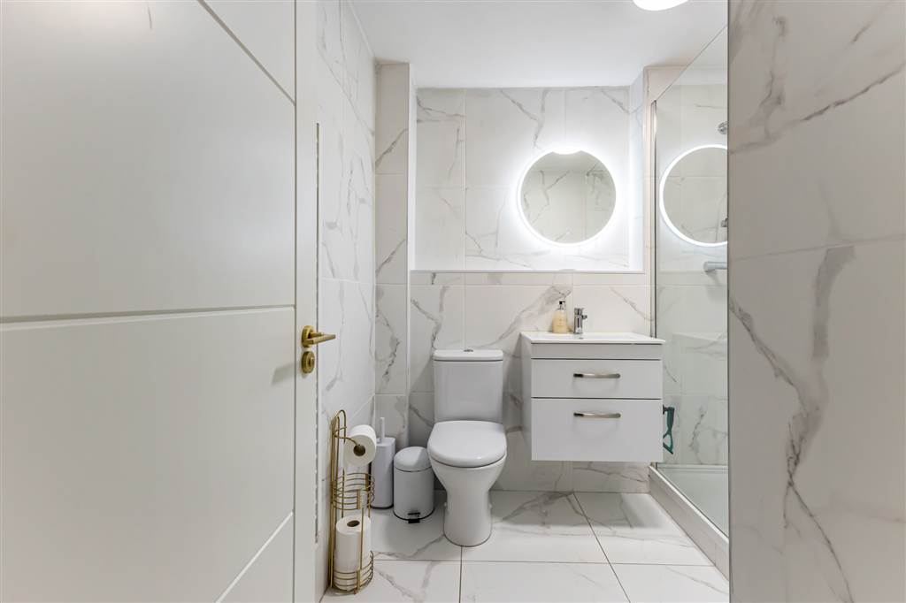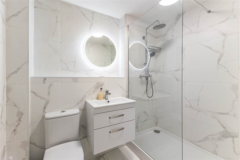 Comprising of double shower with rain shower and shower screen, low flush WC and wash hand basin. Sensor light behind the mirror and fully tiled.