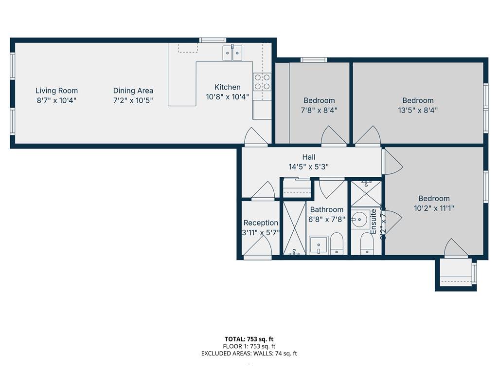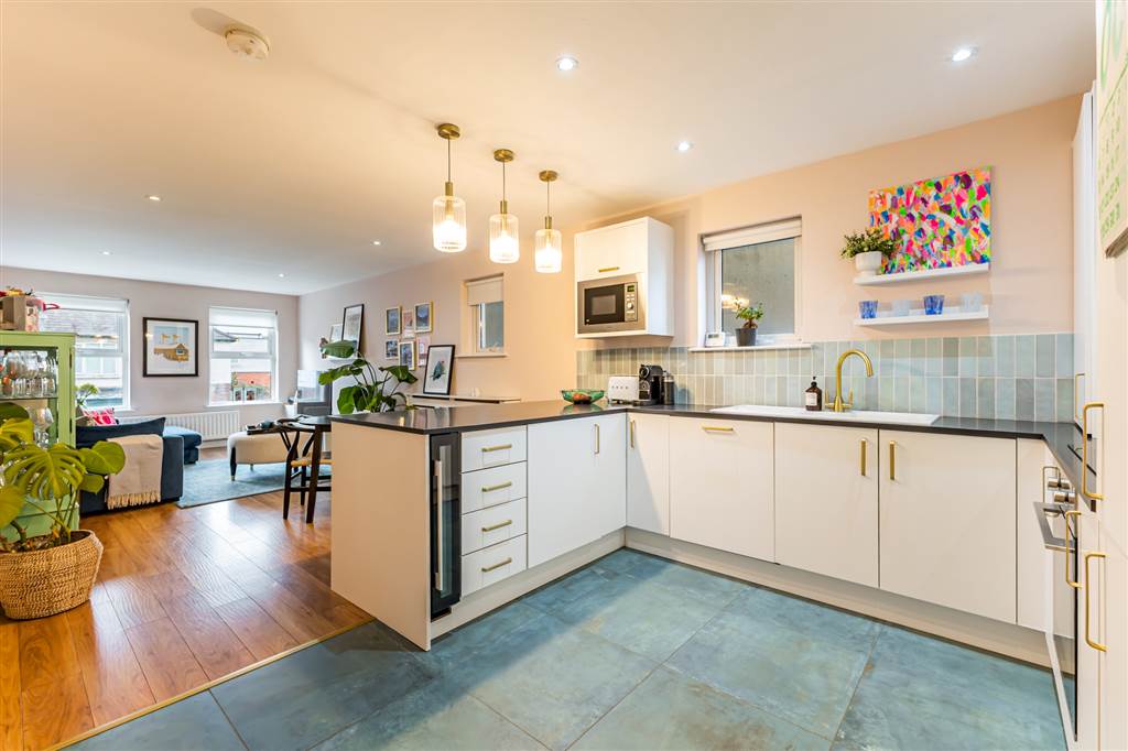 Modern fully fitted kitchen, integrated fridge/freezer, washer dryer, dishwasher, washing machine and wine fridge. Single drainer sink. Part tiled walls and tiled floor in the kitchen. Laminate flooring in the living/dining area