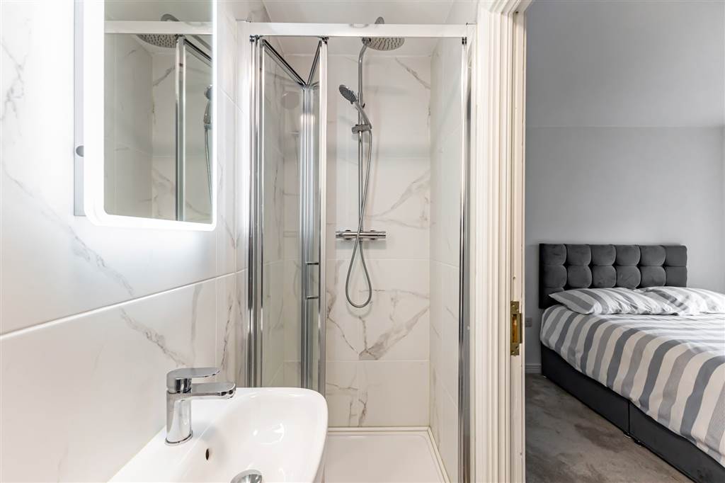 En-suite with tiled shower and shower door, low flush WC and wash hand basin.