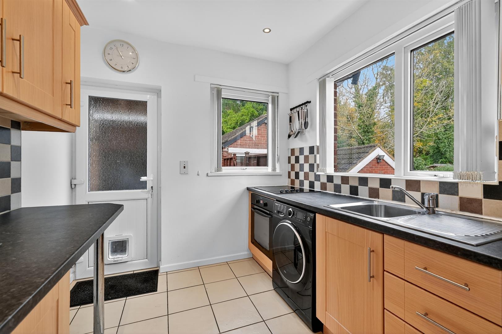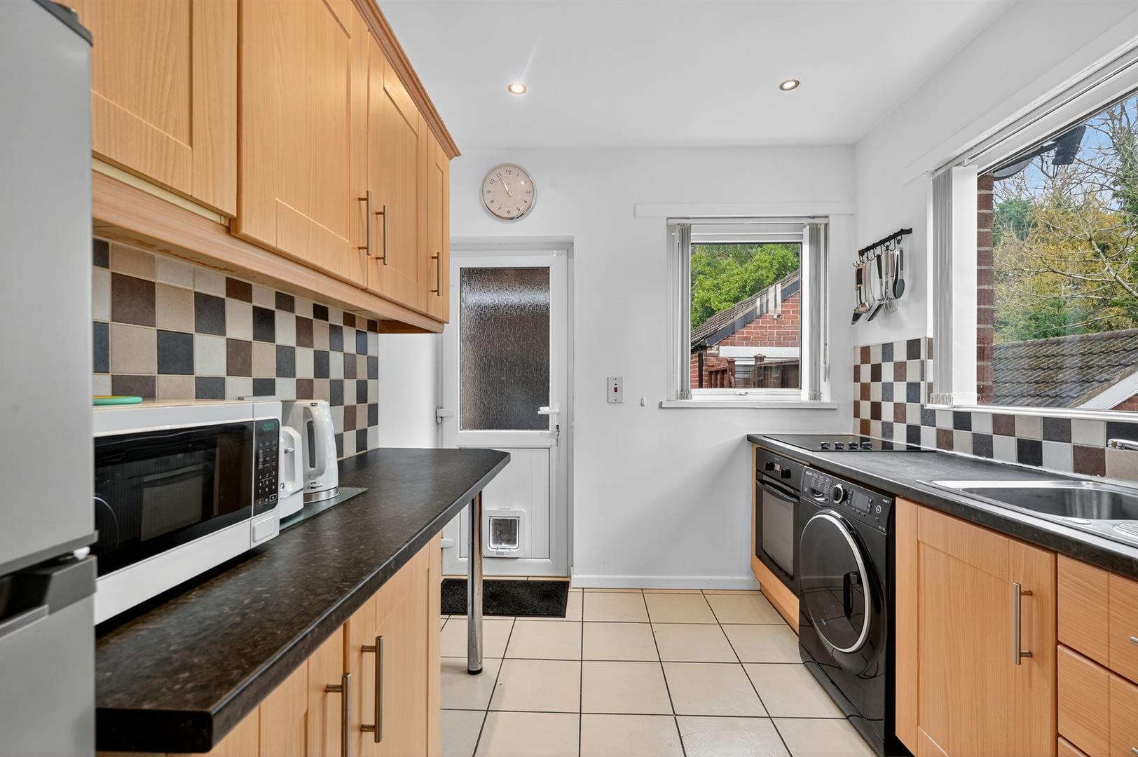 Range of high and low level units, plumbed for washing machine, integrated oven, 4 ring hob, single drainer stainless steel sink unit with mixer tap, recessed spotlighting, tiled floor, part tiled walls.