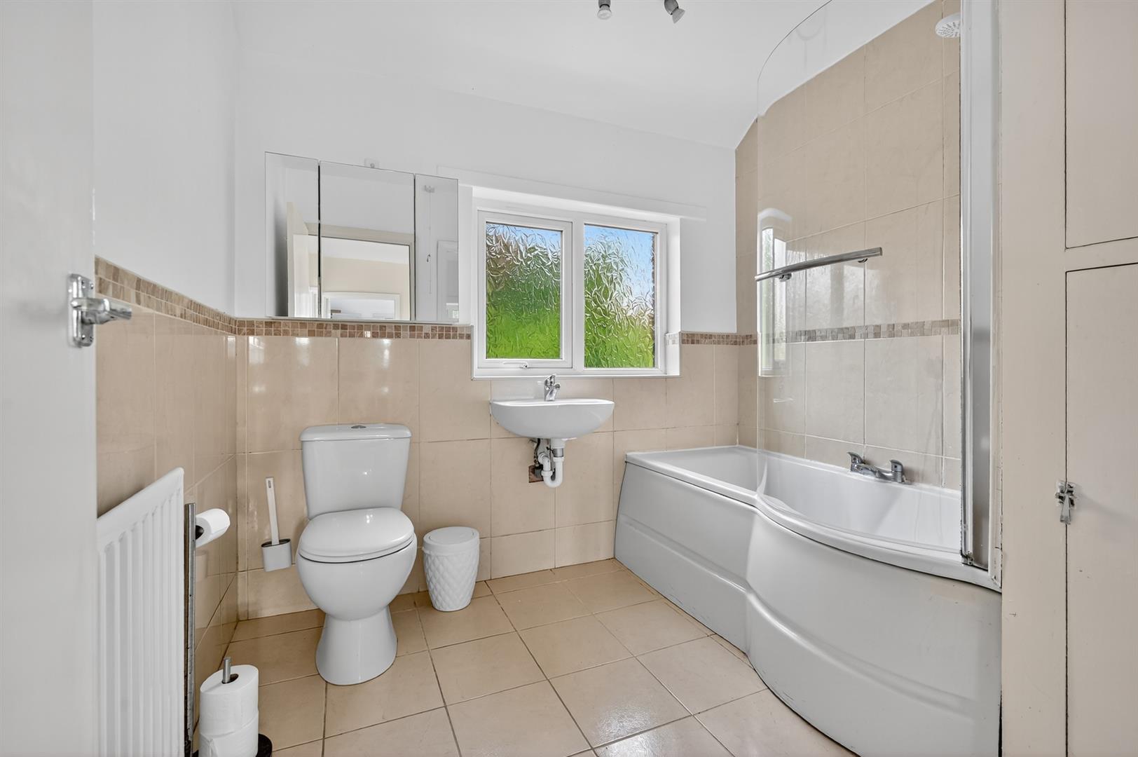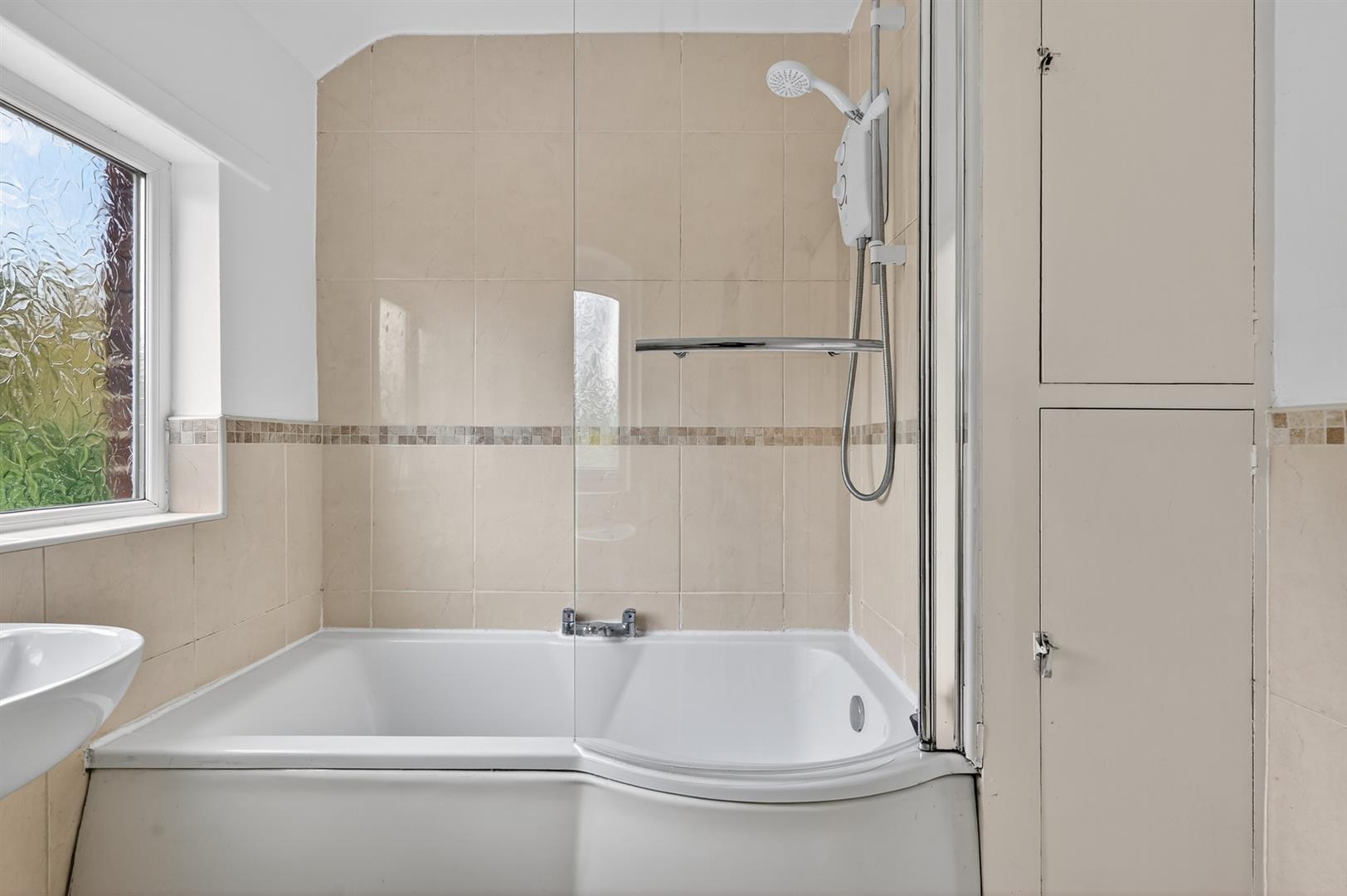 White suite comprising low flush W.C, wash hand basin, panel bath with electric shower over, part tiled walls, tiled floor.