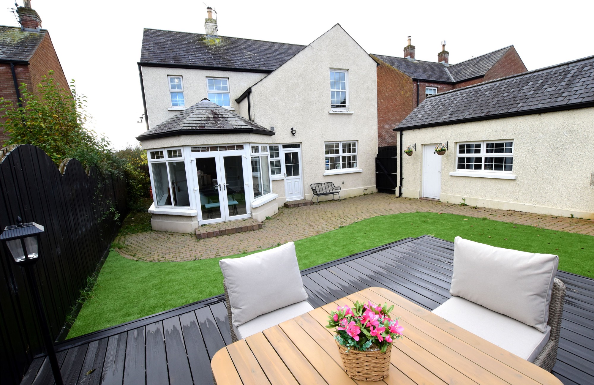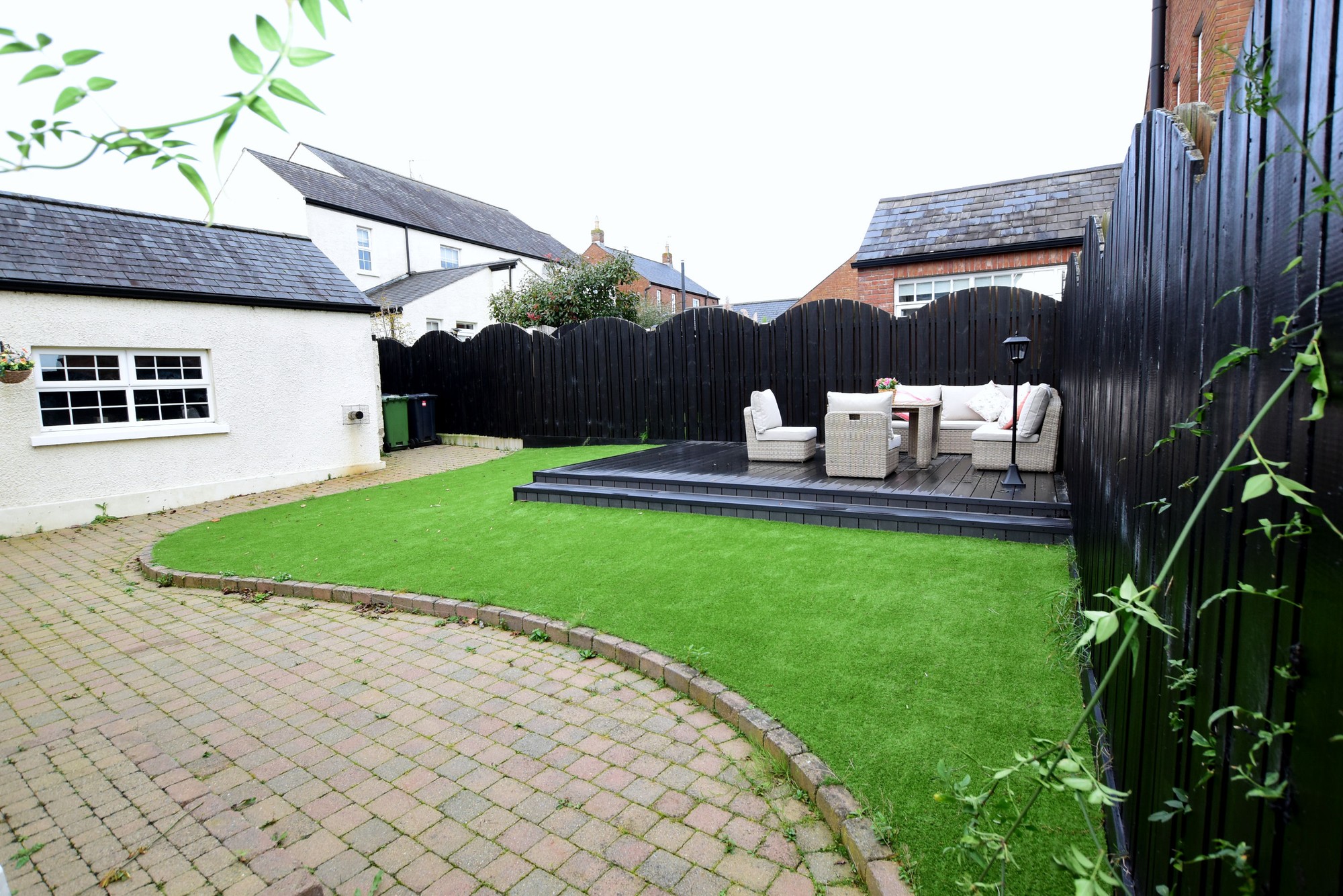 Garden to front in lawn with lovely rural aspect overlooking the countryside. Enclosed easily maintained rear garden in artificial grass and with a large paved patio and a feature composite sundeck.