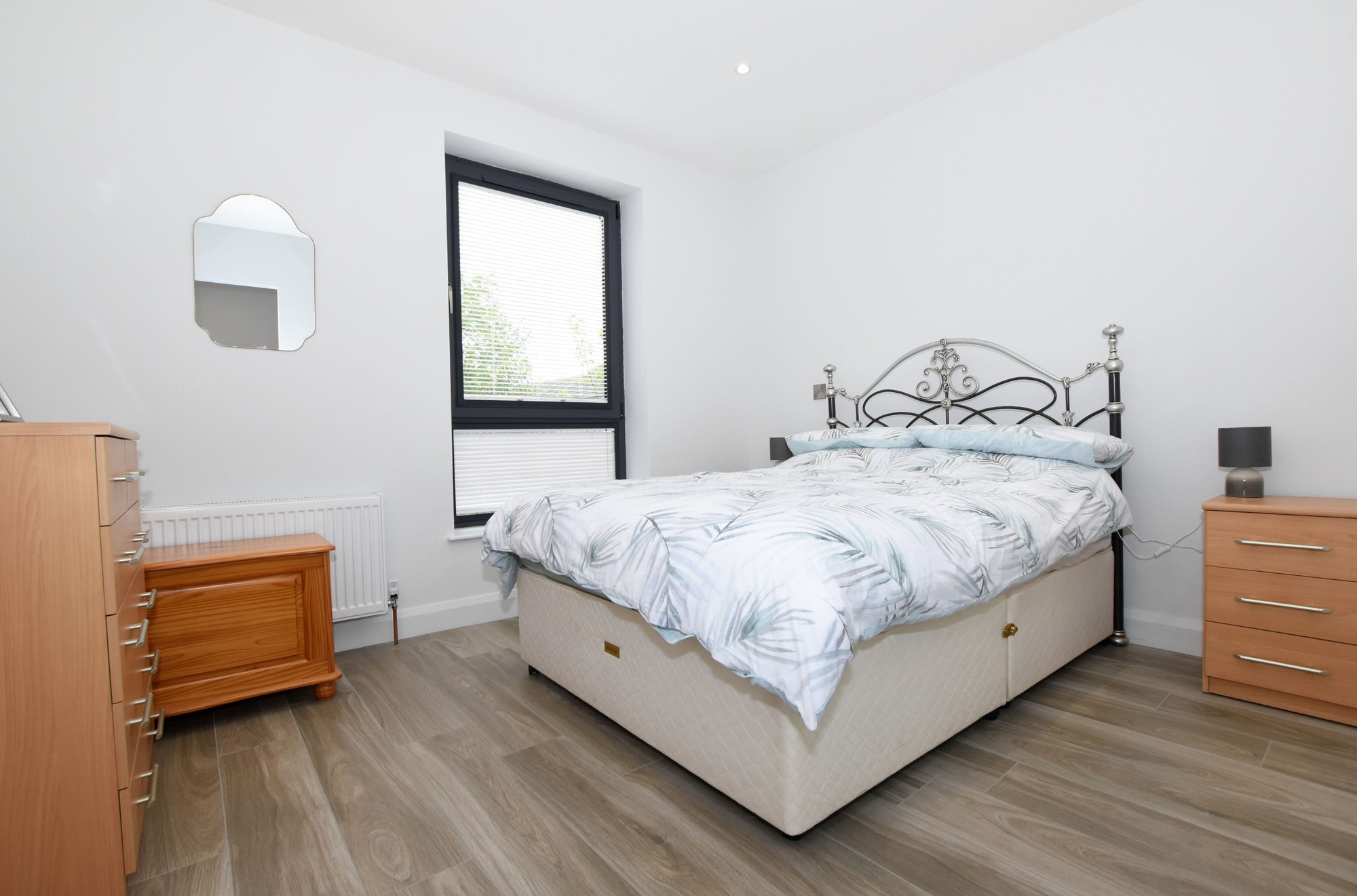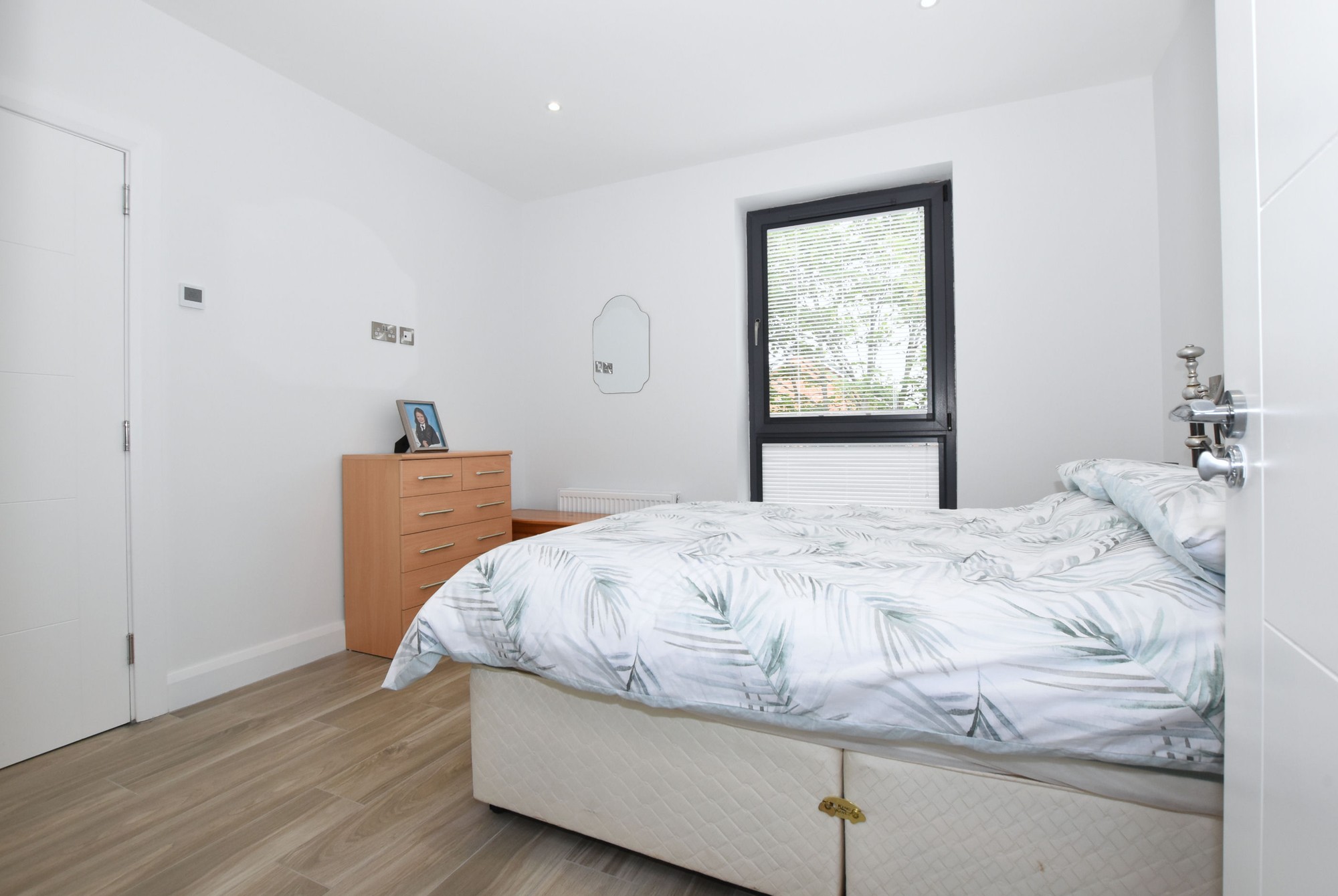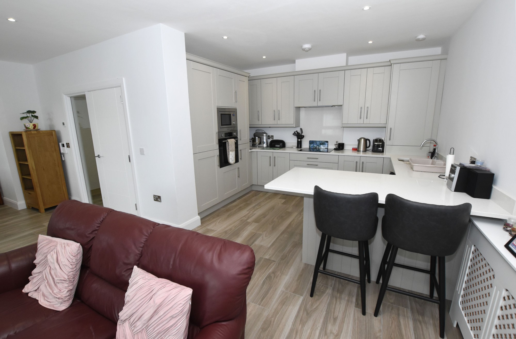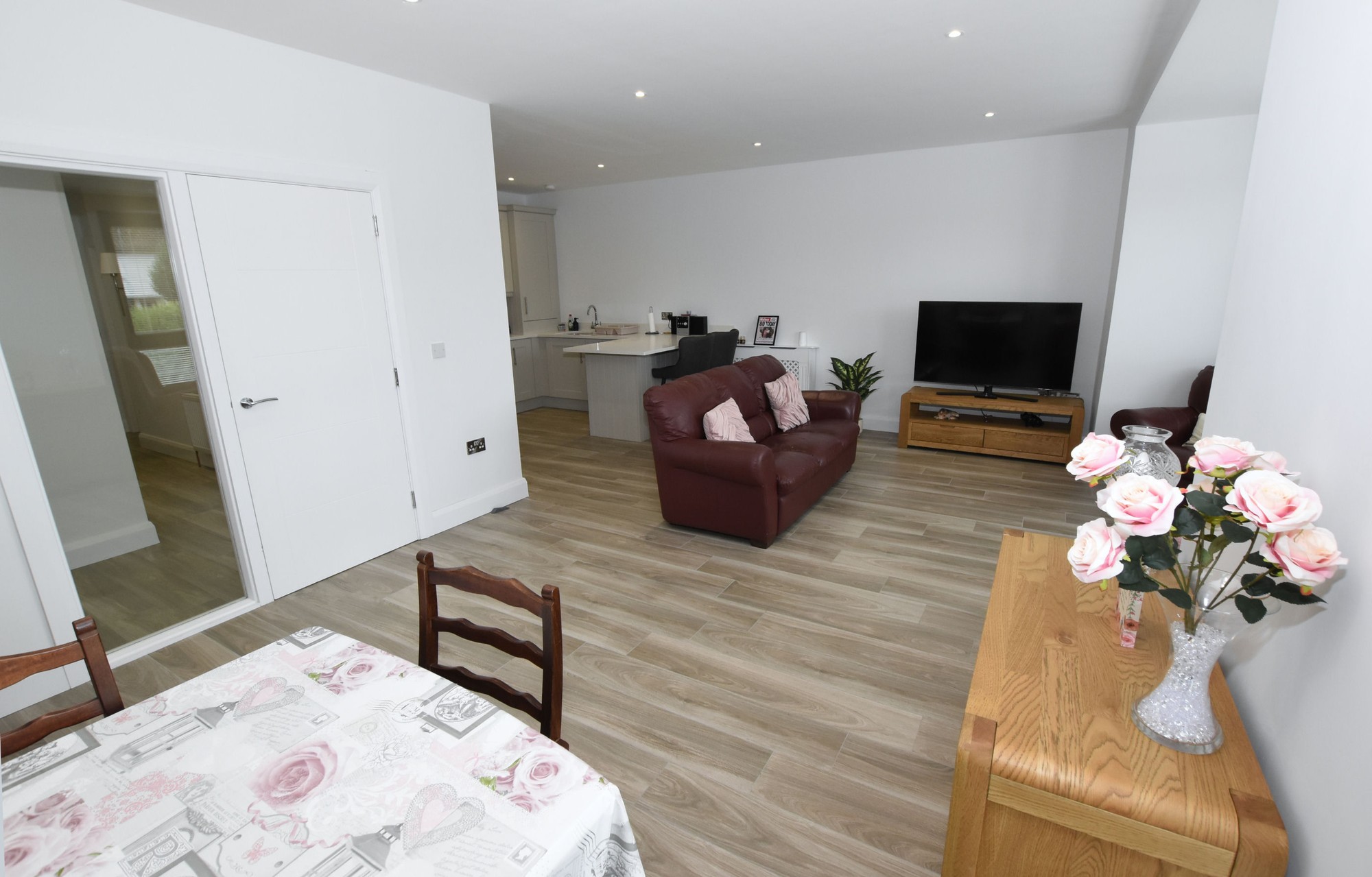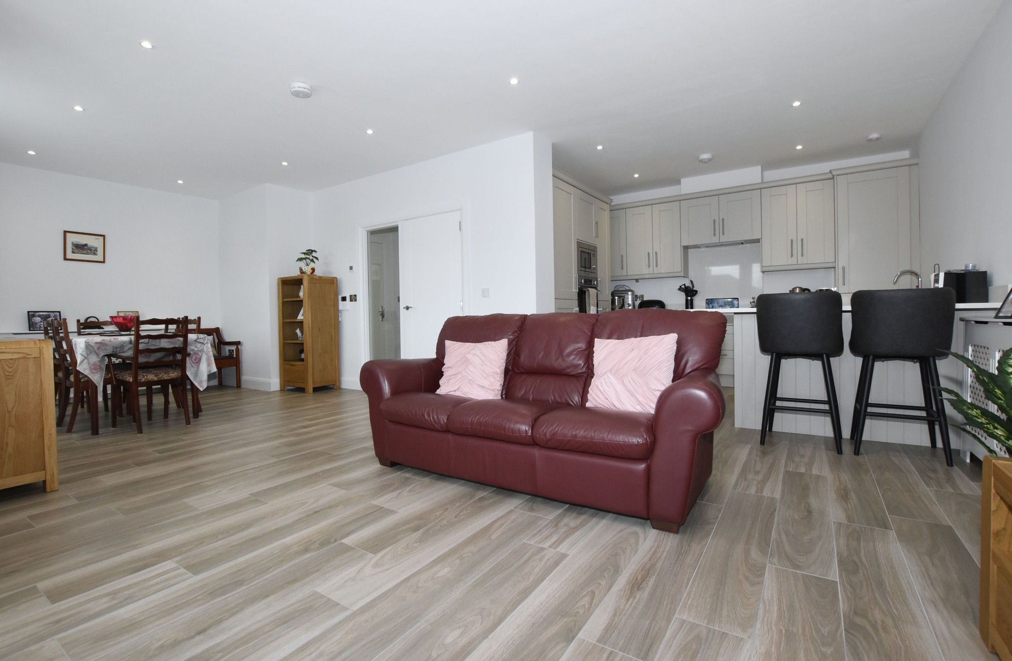 Wood effect tiled floor. Low voltage downlights.