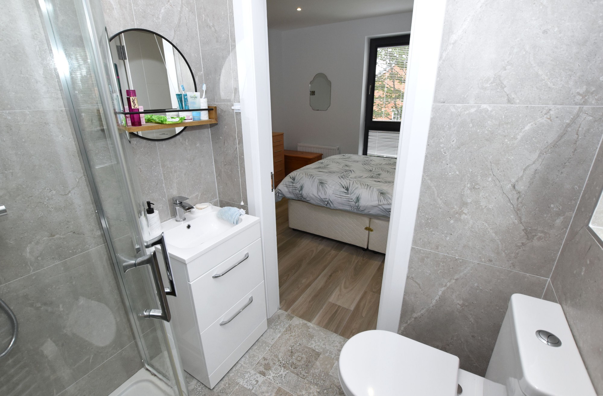 Modern white coloured suite comprising; low flush wc, vanity unit with inset wash hand basin and fully tiled shower cubicle. Wood effect tiled floor. PVC panelled ceiling with low voltage downlights for easy maintenance.