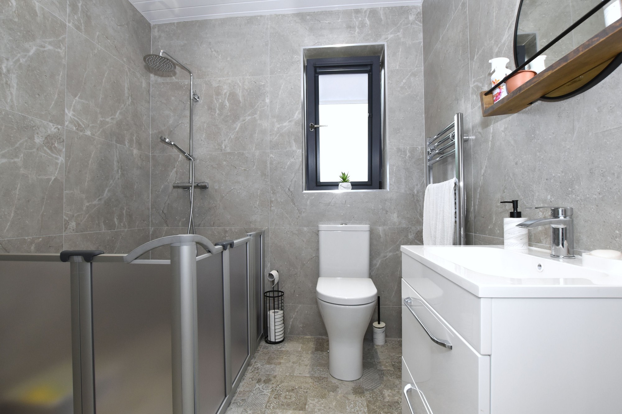 Contemporary white coloured suite comprising; low flush wc, vanity unit with inset wash hand basin and fully tiled wet area with chrome shower and half height glass shower screen. Wood effect tiled floor. PVC panelled ceiling with low voltage downlights for easy maintenance. Chrome heated towel rail.