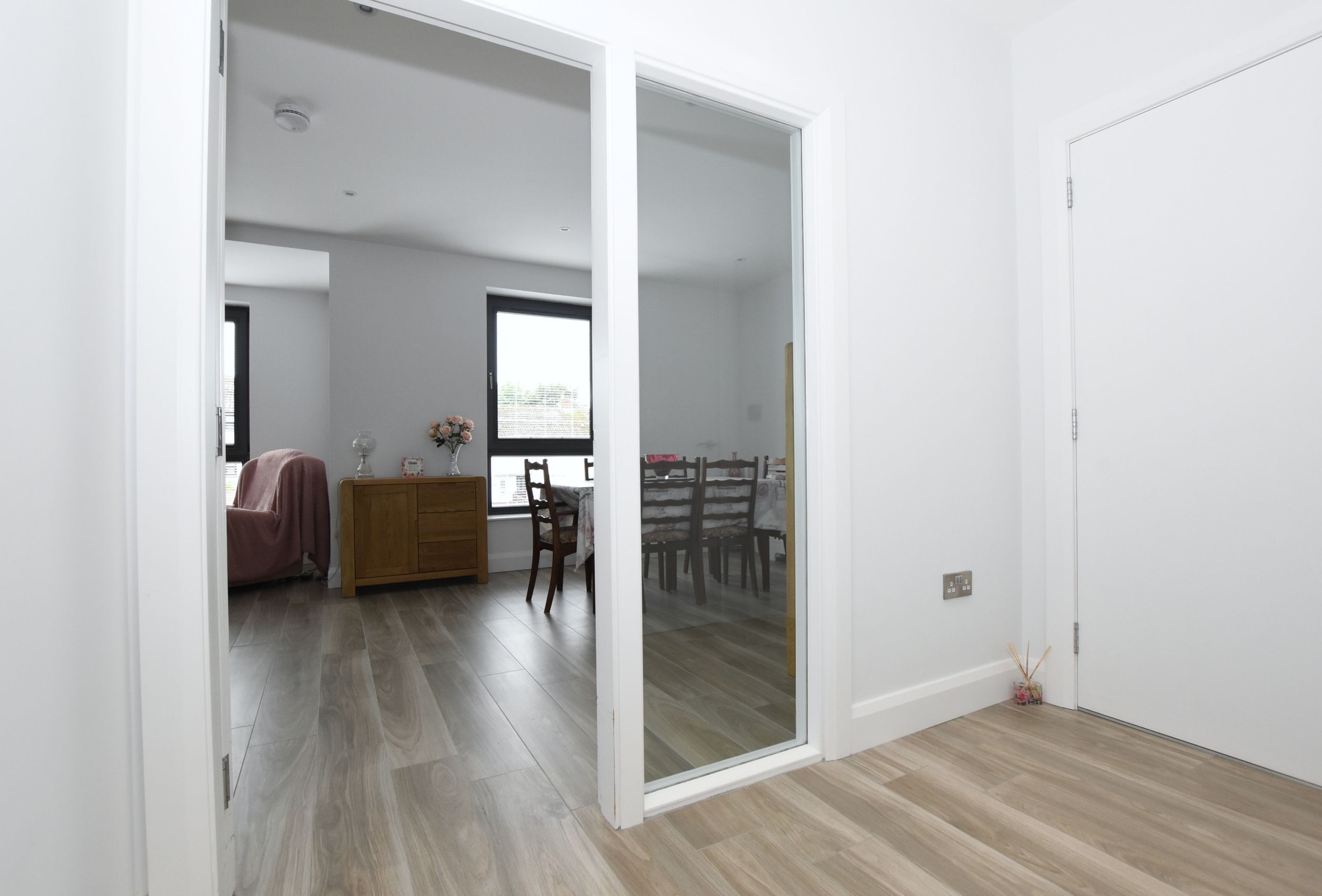 Entrance door from the communal hallway, built-in cloaks cupboard. Intercom to the main front door and gates. Wood effect tiled floor.