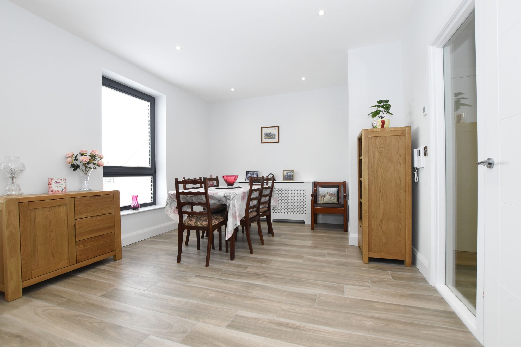 Wood effect tiled floor. Low voltage downlights