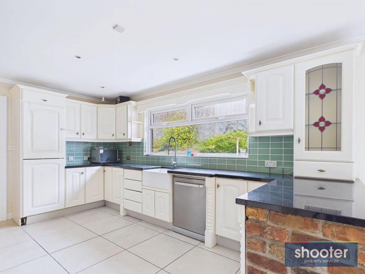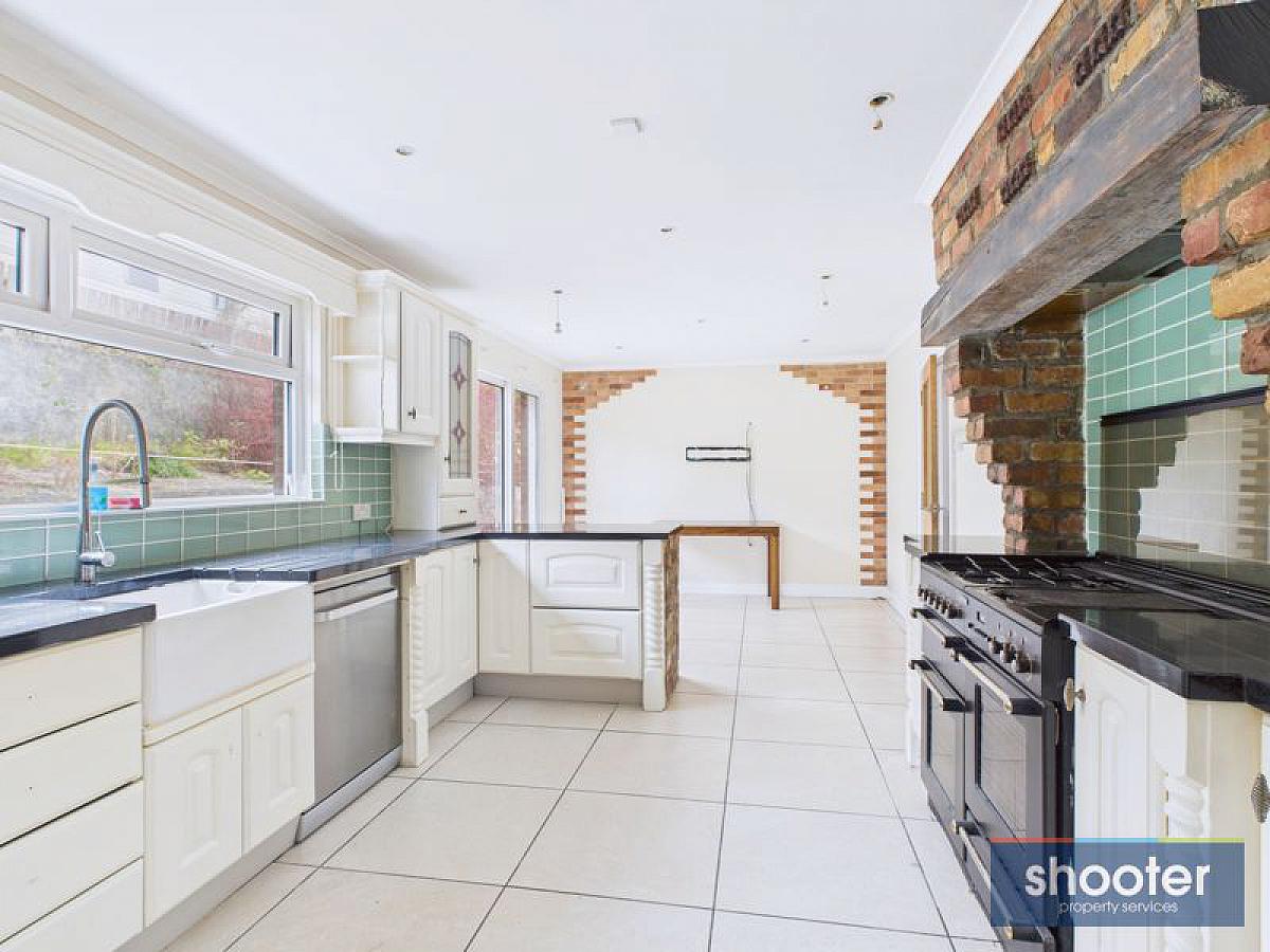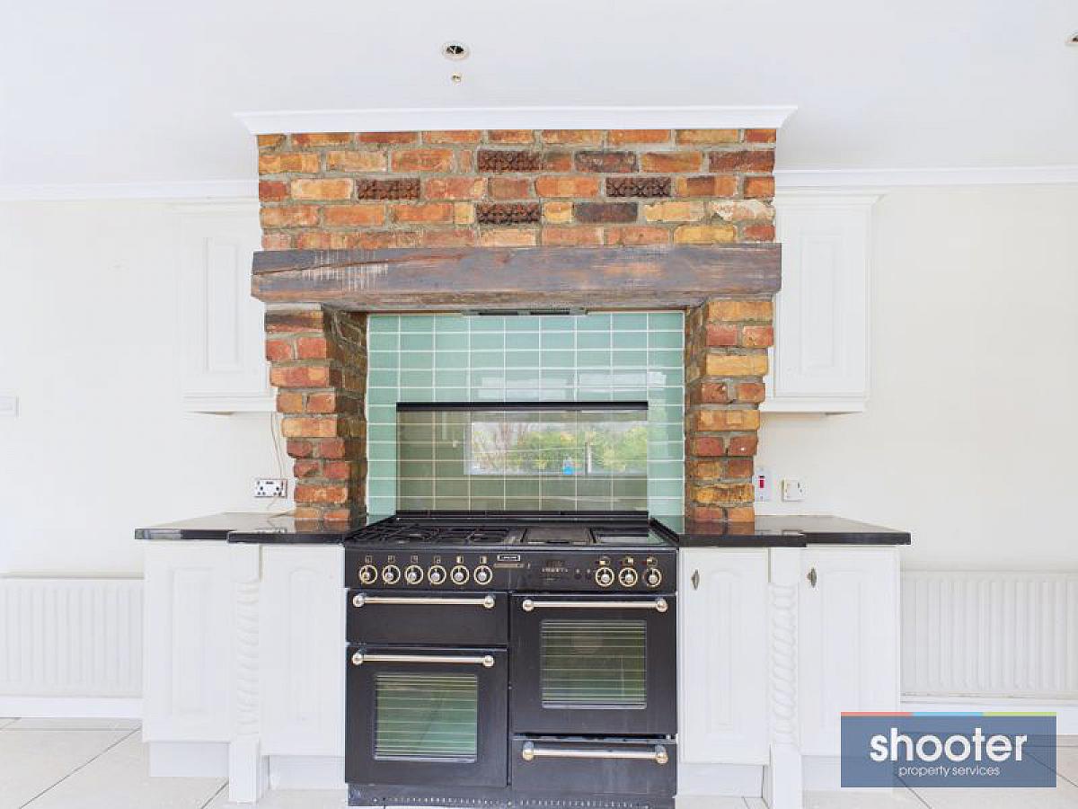 Modern range of high and low level solid pine units with granite worktops incorporating Belfast sink unit, fridge-freezer, dishwasher, Range Master cooker and extractor hood with brick surround. Television point. Ceramic tile floor and part tiled walls. PVC French doors to patio.