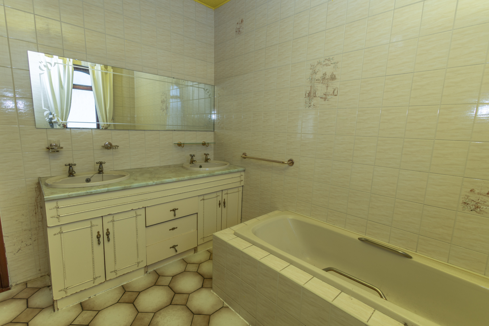 Decorative tiled honeycomb style floor, tiled wall surround, seperate bath and shower, toilet, his and hers vanity sink.