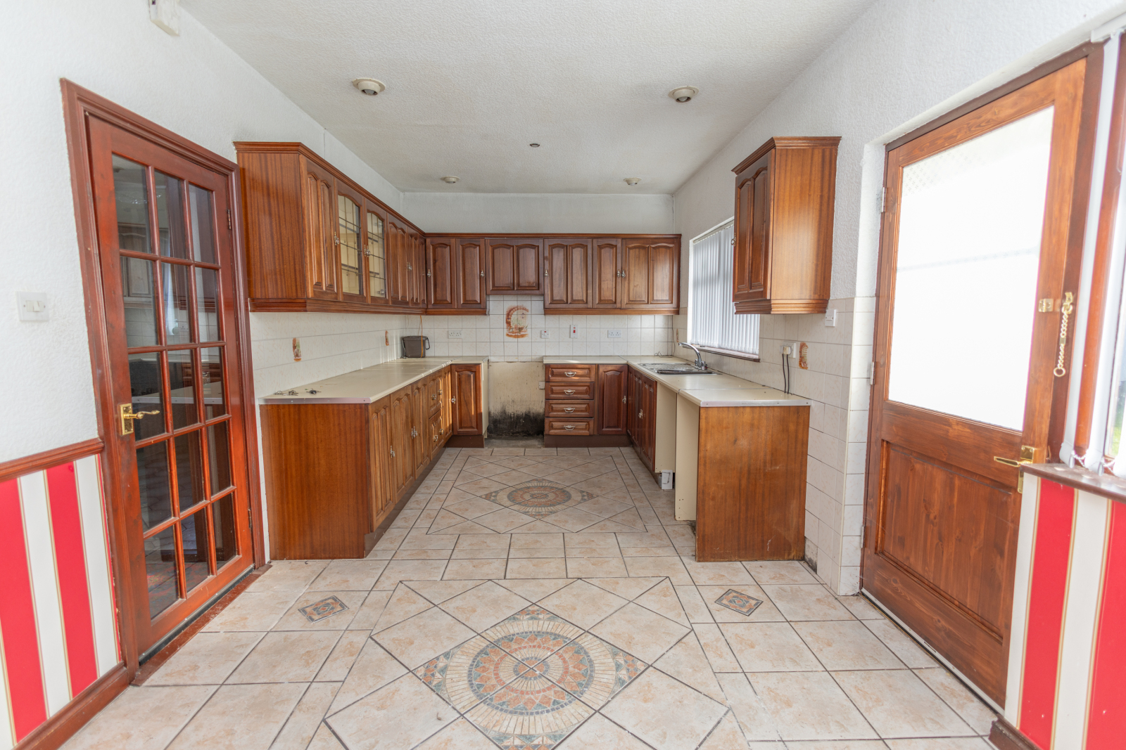 Decorative tiled floor, high and low level storage units, tiled splash back, surface mounted down lights.