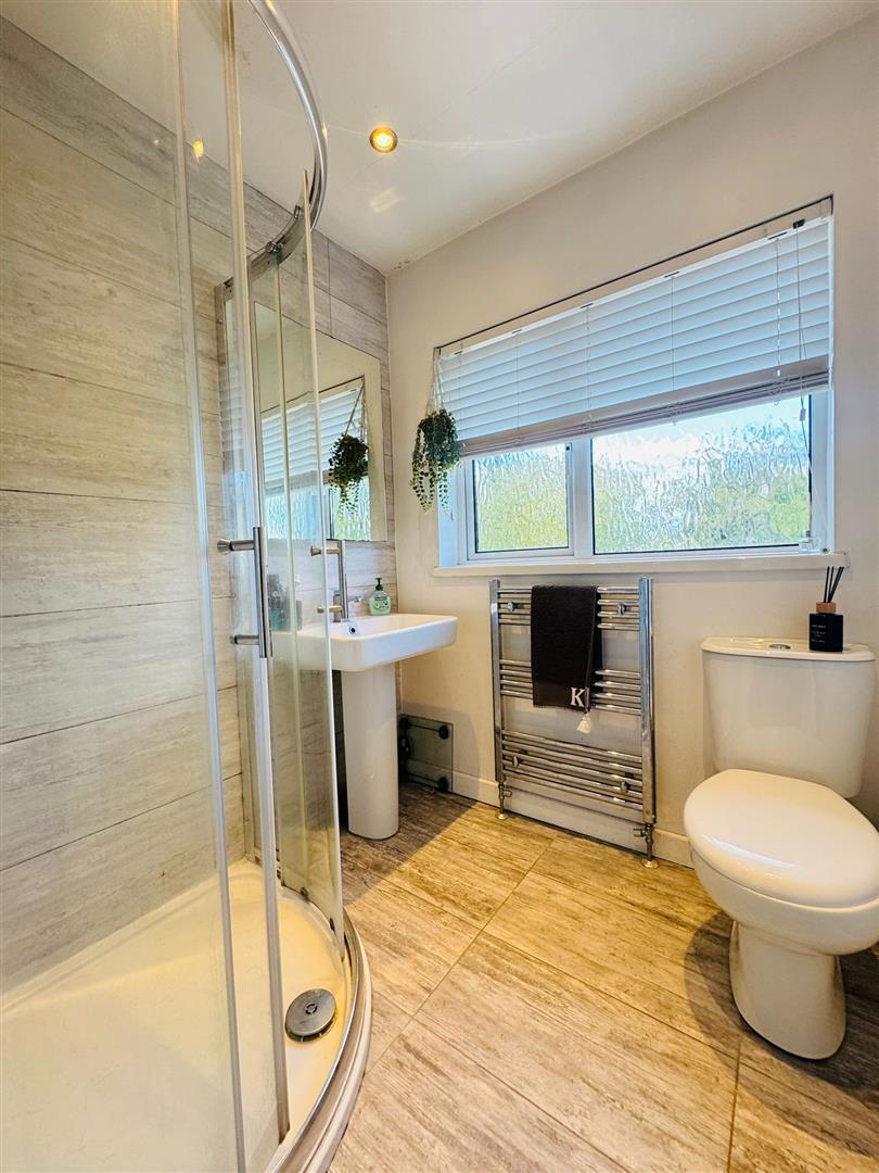 Chrome shower cubicle, redring electric shower, pedestal wash hand basin, low flush wc, tiled floor, chrome heated towel radiator