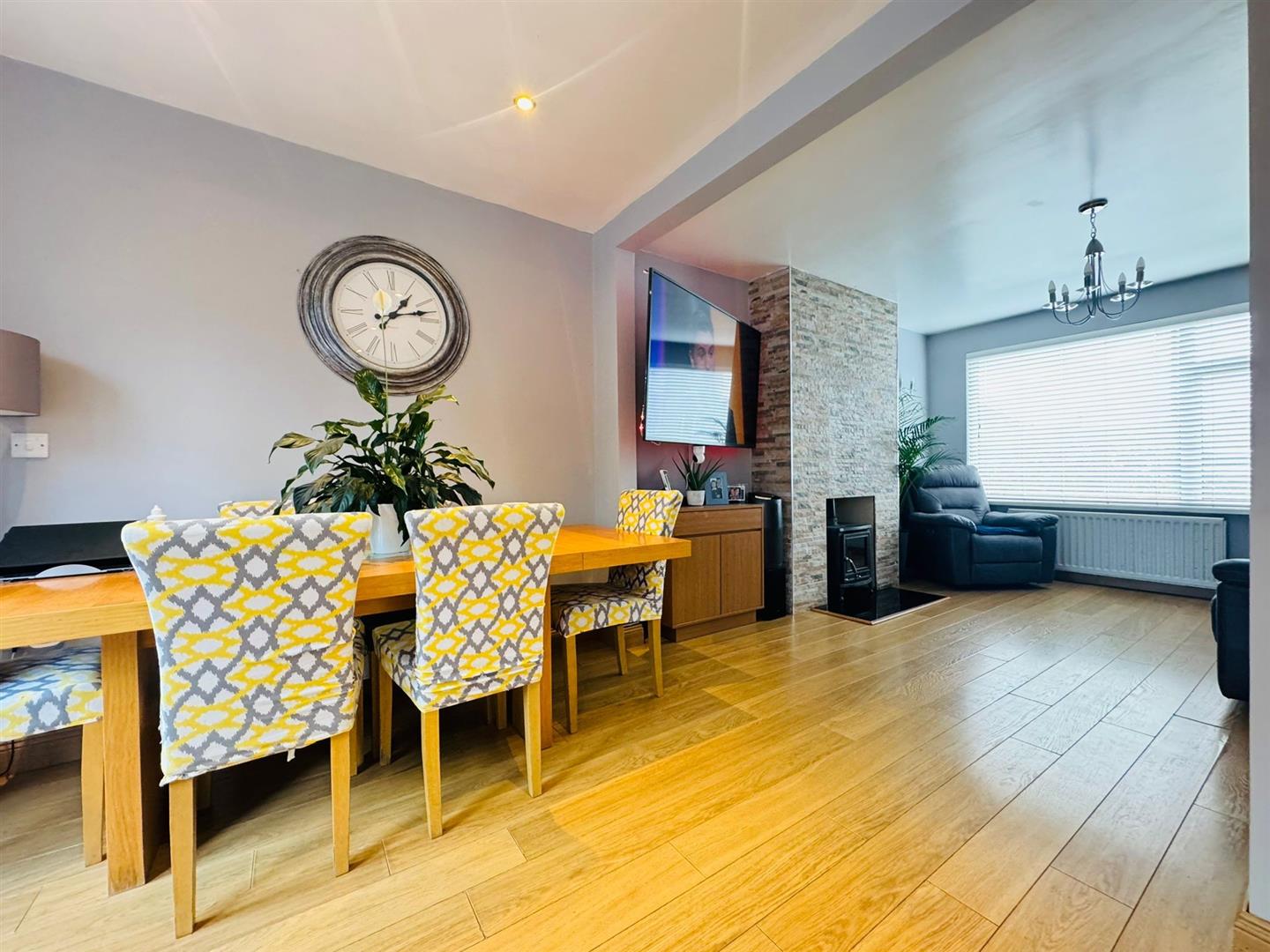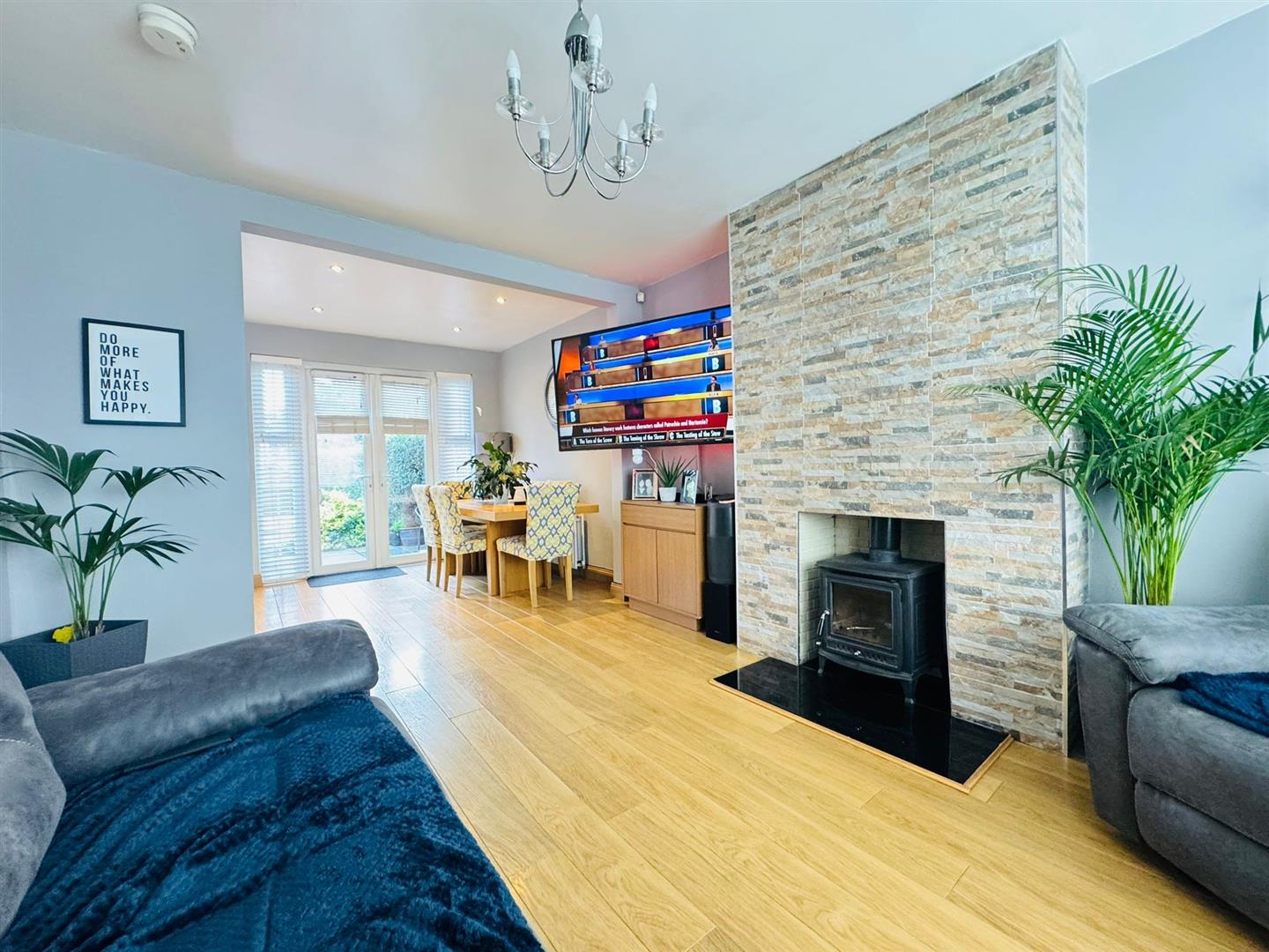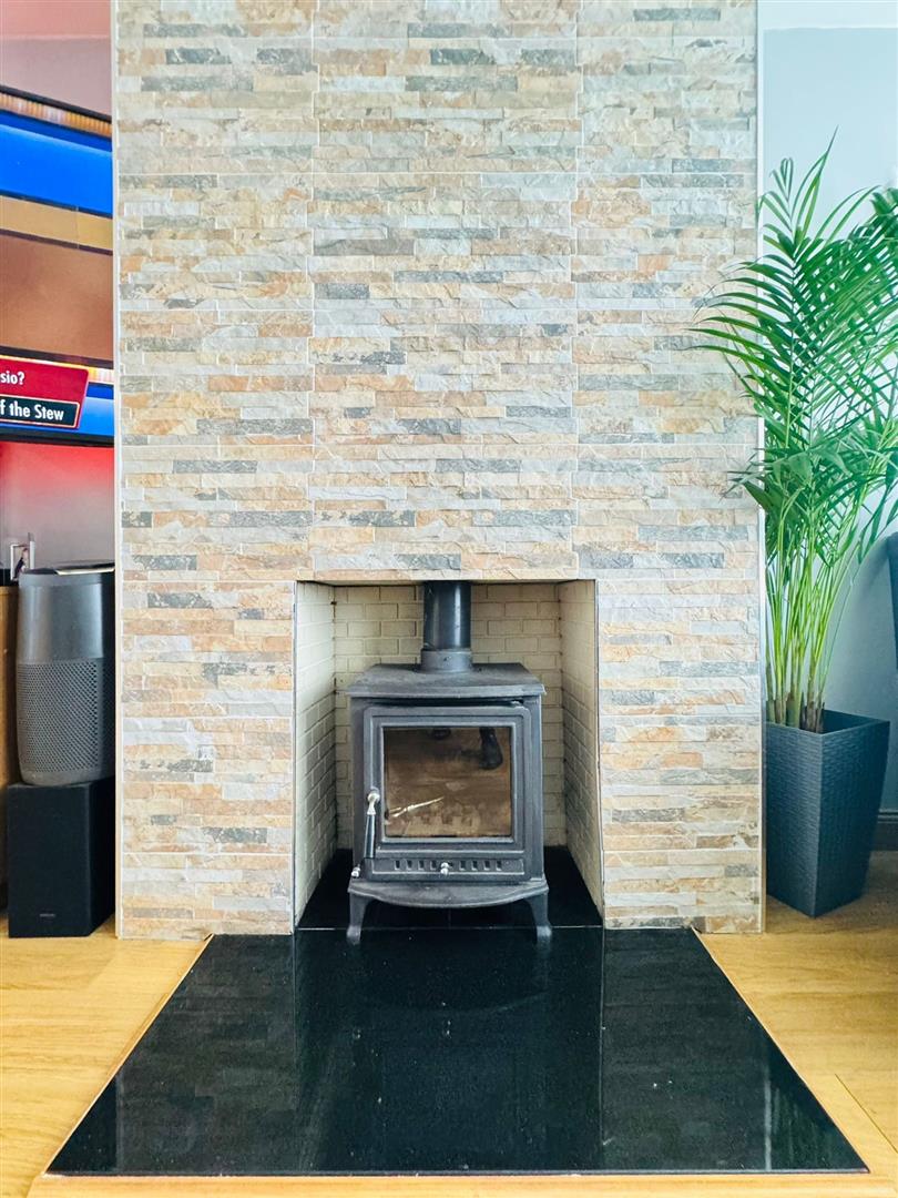 Feature tiled chimney breast with wood burning stove, wood laminate flooring, radiator, open to kitchen / diner