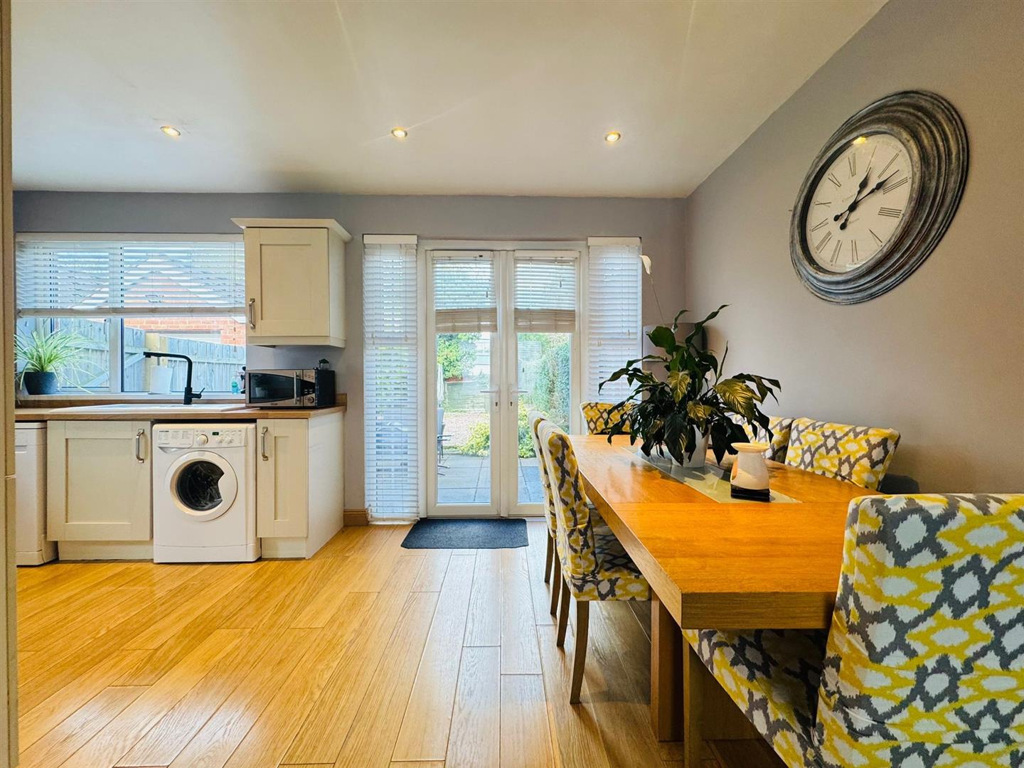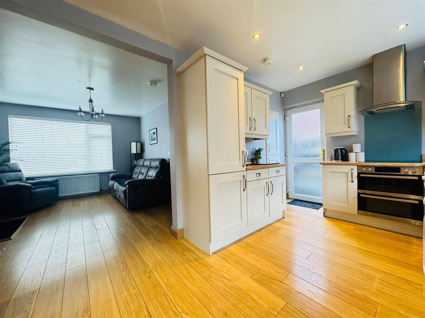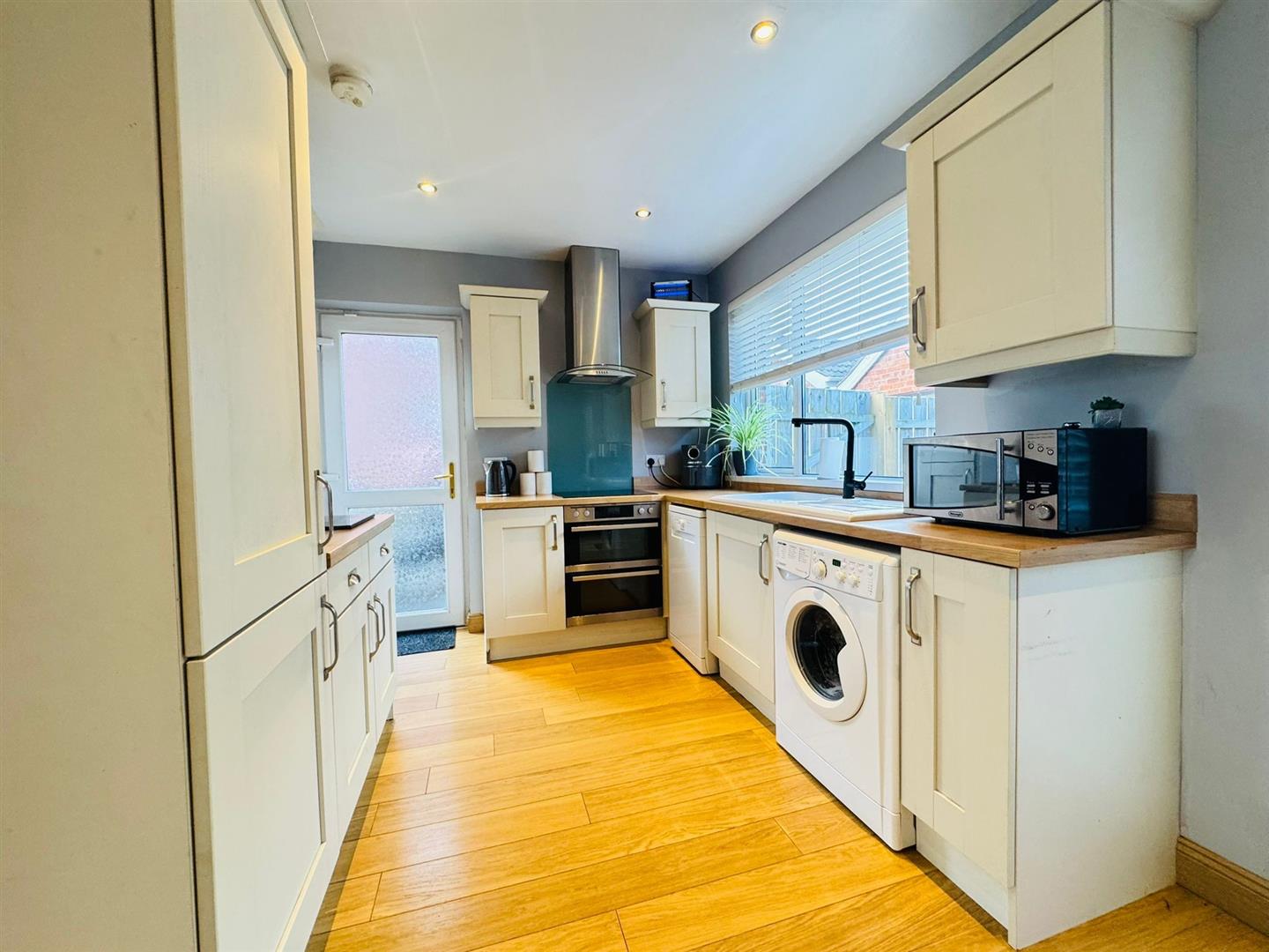 Inside the accommodation comprises; entrance hall, lounge with feature tiled chimney breast with wood burning stove, wood laminate flooring and open to a modern shaker style fitted kitchen / diner with built in oven and hob and PVC double glazed double doors to garden.